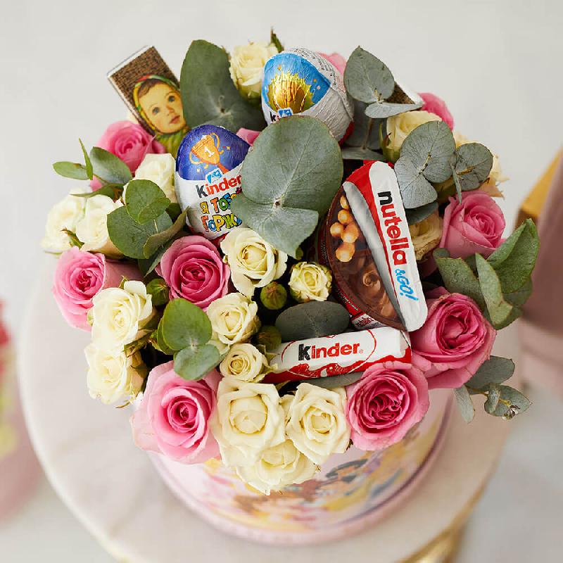 • кустовые розы - 10 шт., киндер сюрприз - 2 шт., розовые розы - 9 шт., аленка - 1 шт., эвкалипт