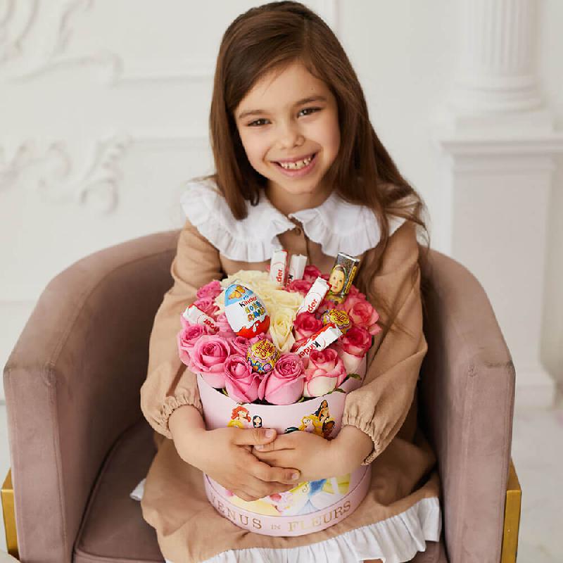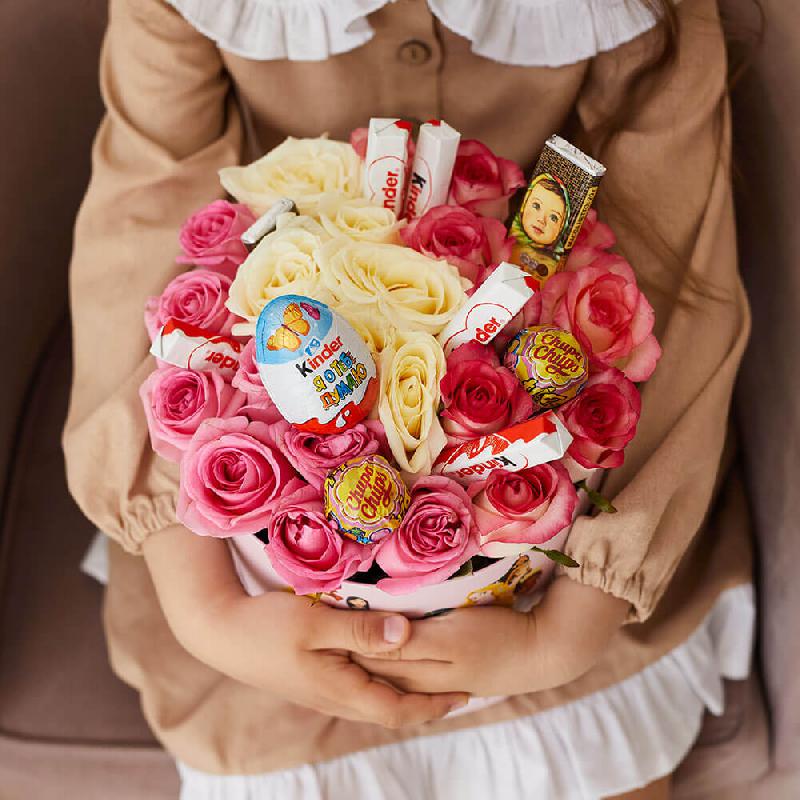 • 25 роз, киндер сюрприз - 1 шт., киндер шоколад - 4 шт., чупа-чупс - 2 шт., аленка - 2 шт