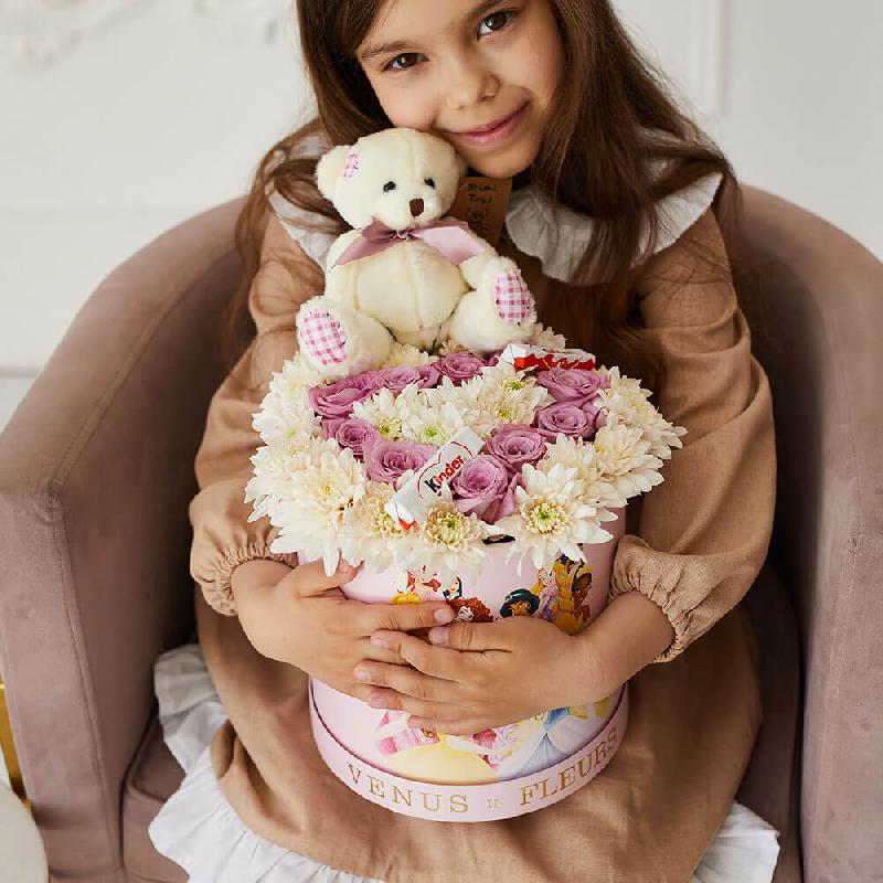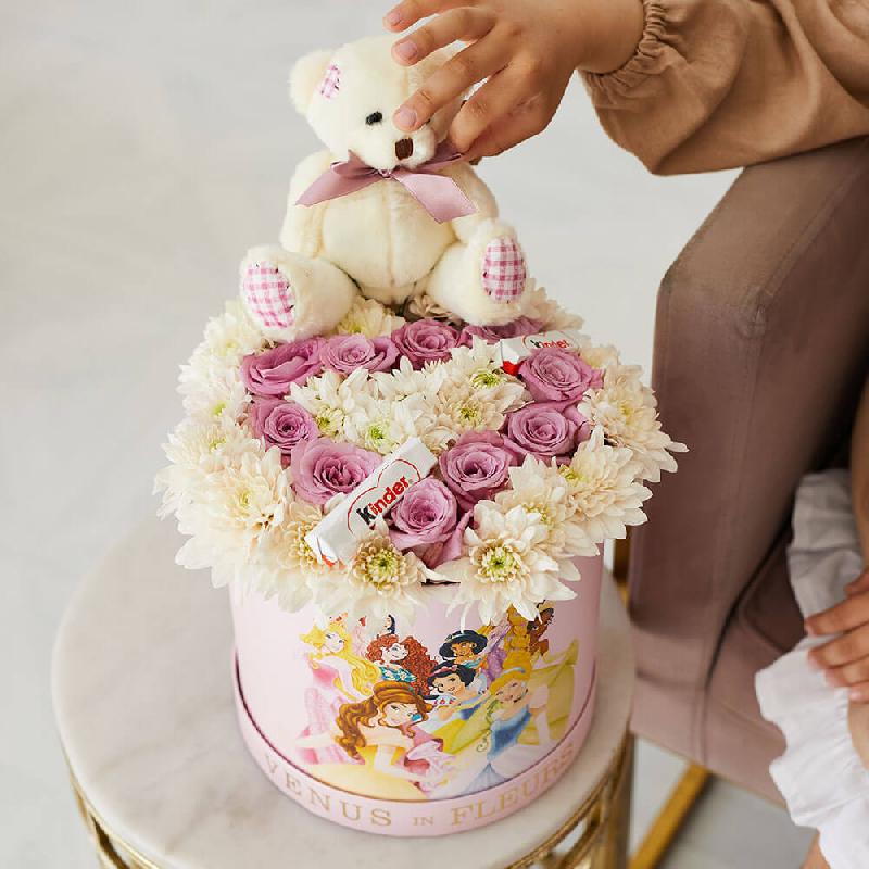 • кустовая хризантема - 5 шт., розы - 10 шт., киндер шоколад - 3 шт., мишка - 1 шт.