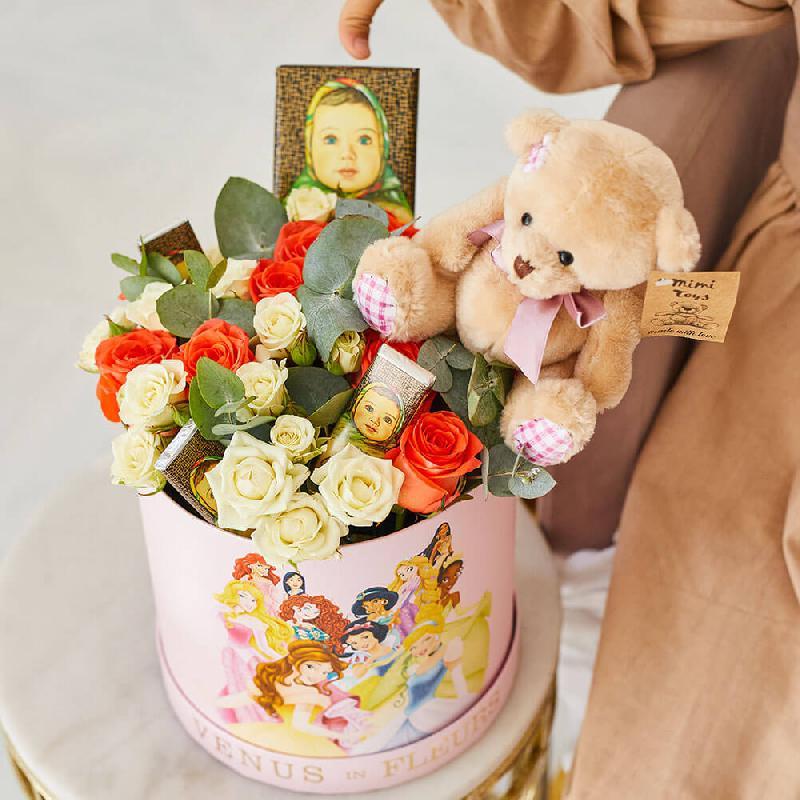 • кустовые розы - 10 шт., мишка - 1 шт., розы - 9 шт., аленка - 3 шт.