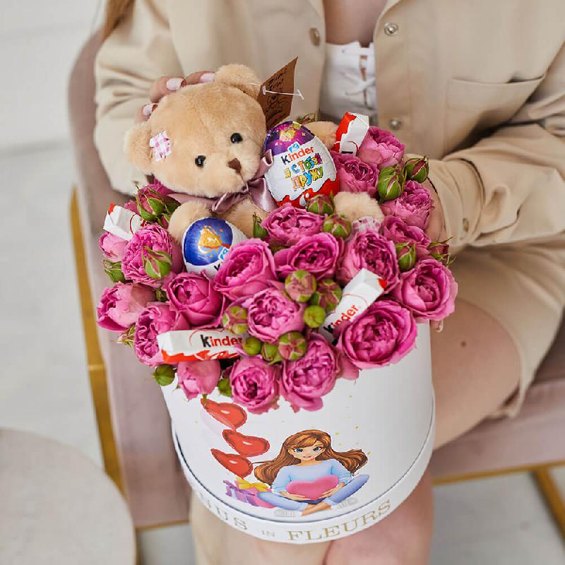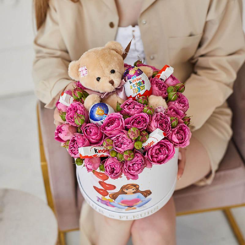 • кустовая пионовидная роза - 10 шт., киндер сюрприз - 2 шт., киндер шоколад - 4 шт., мишка - 1 шт.