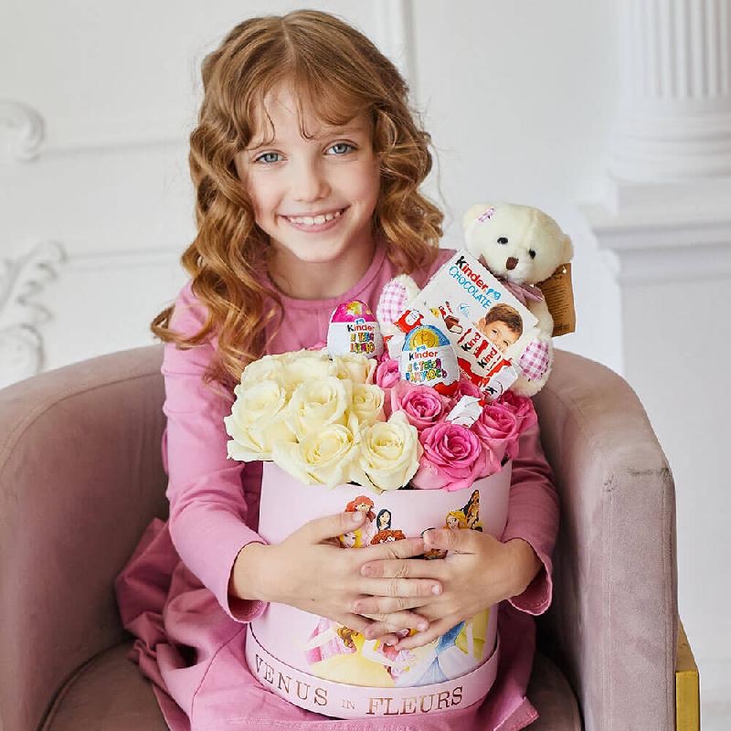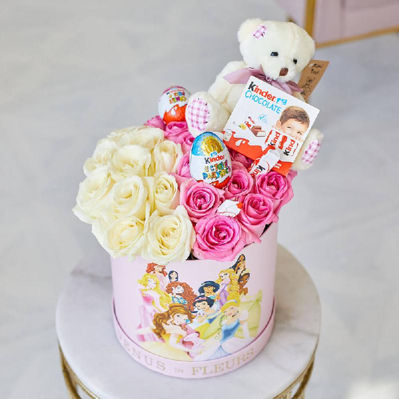 • киндер сюрприз - 2 шт., киндер шоколад - 8 шт., мишка - 1 шт., розы - 20 шт.