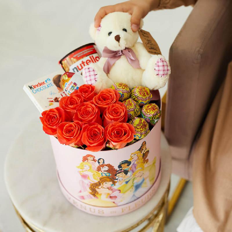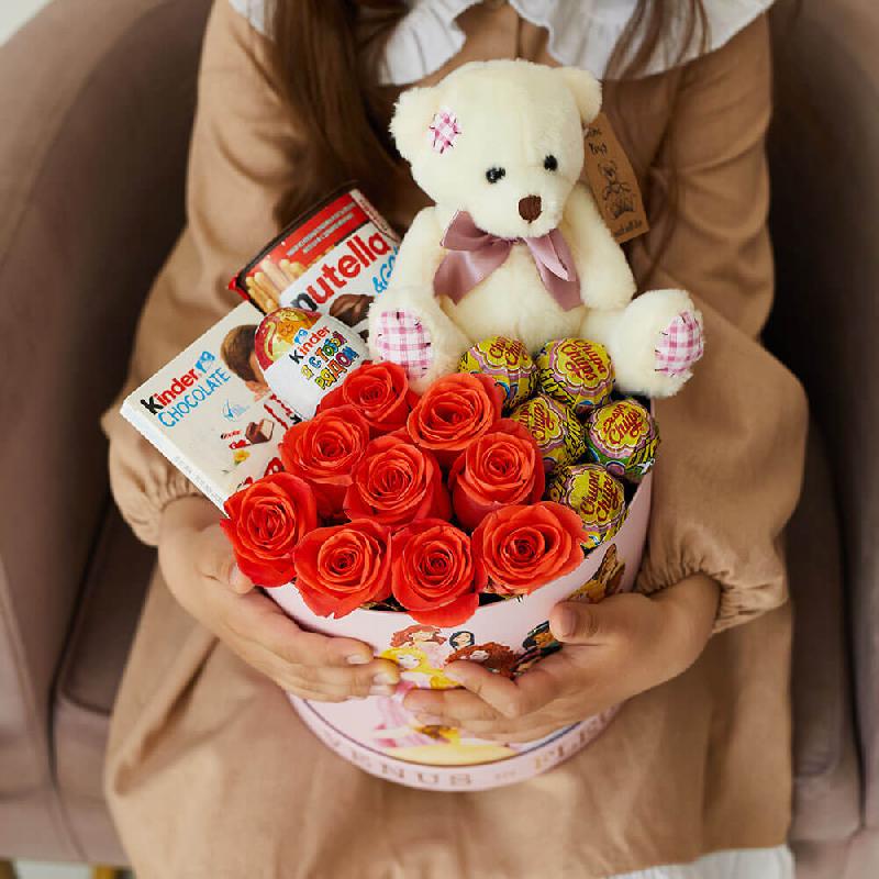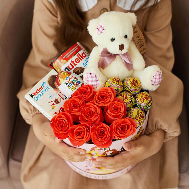 • 9 роз, nuttela с палочками - 1 шт., киндер сюрприз - 1 шт., киндер шоколад - 4 шт., чупа чупс - 5 шт., мишка - 1 шт.