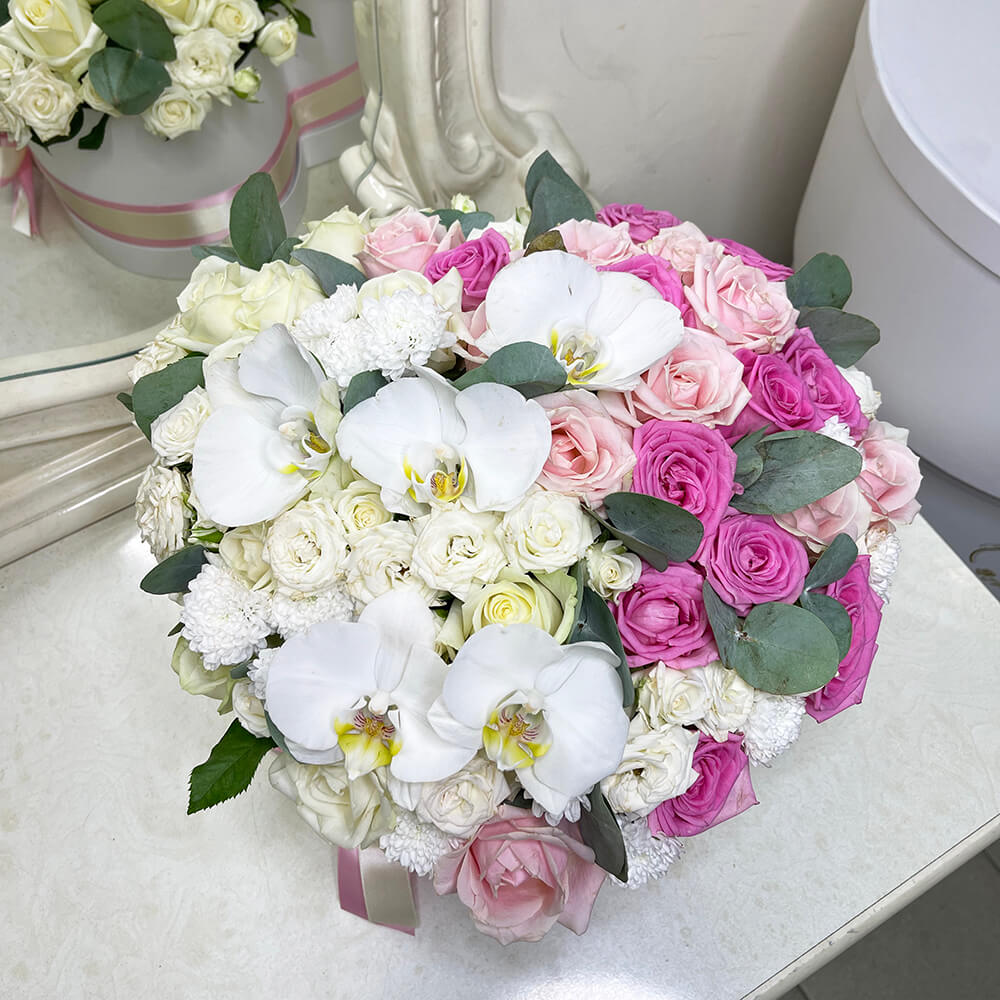 Сочетание орхидей с другими цветами делает букет уникальным и шикарным.