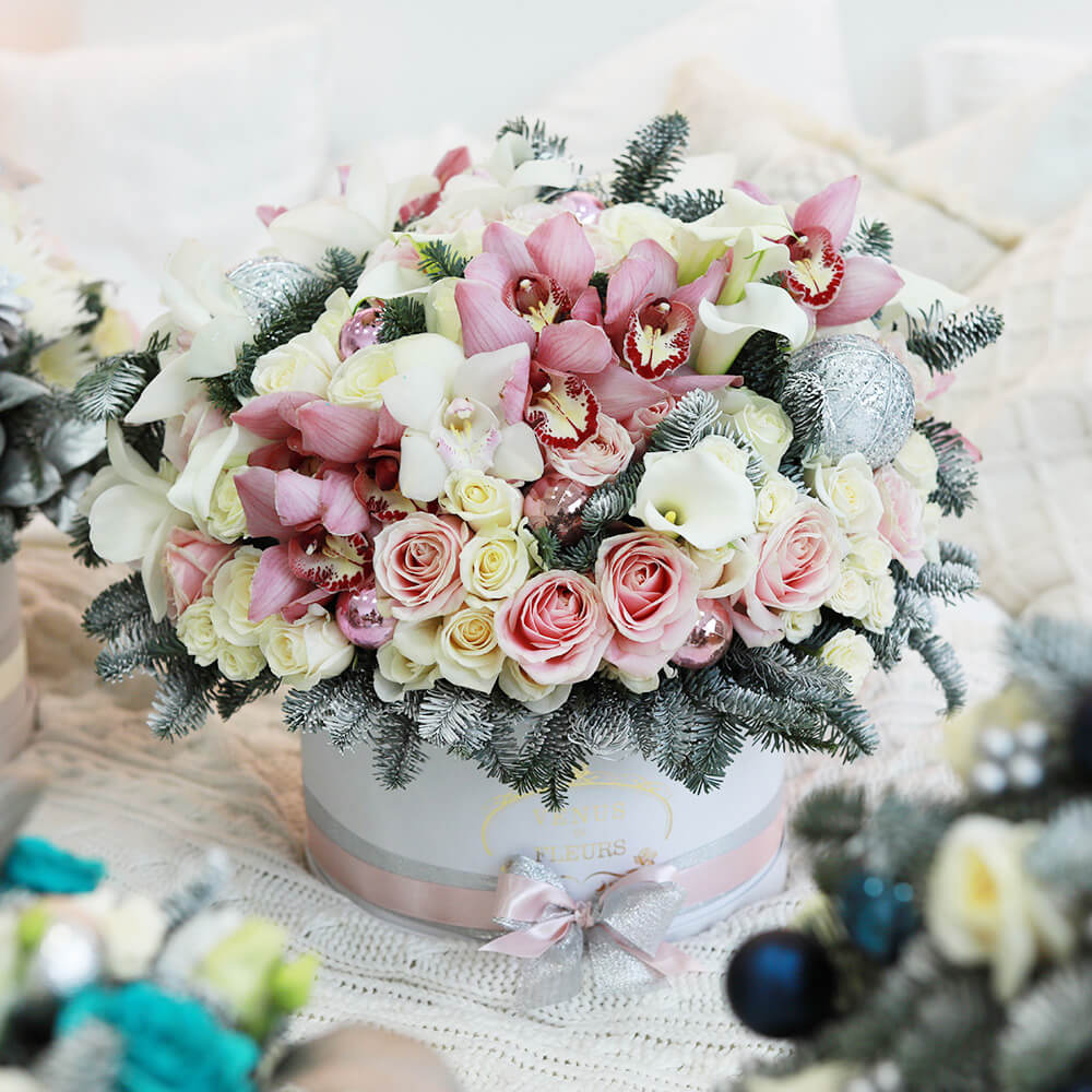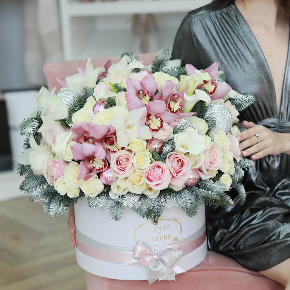 Экзотический новогодний букет в коробке - это отличный подарок на Новый год, который восхитит своей красотой, необычностью и элегантностью.