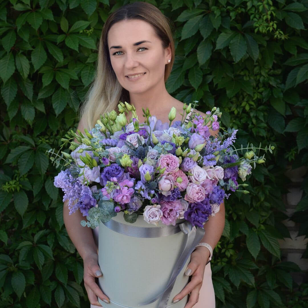• 10 эустом, 10 пионовидных роз, 10 кустовых роз, 1 эрингиум, 10 маттиол, 10 статицы, эвкалипт, вероника