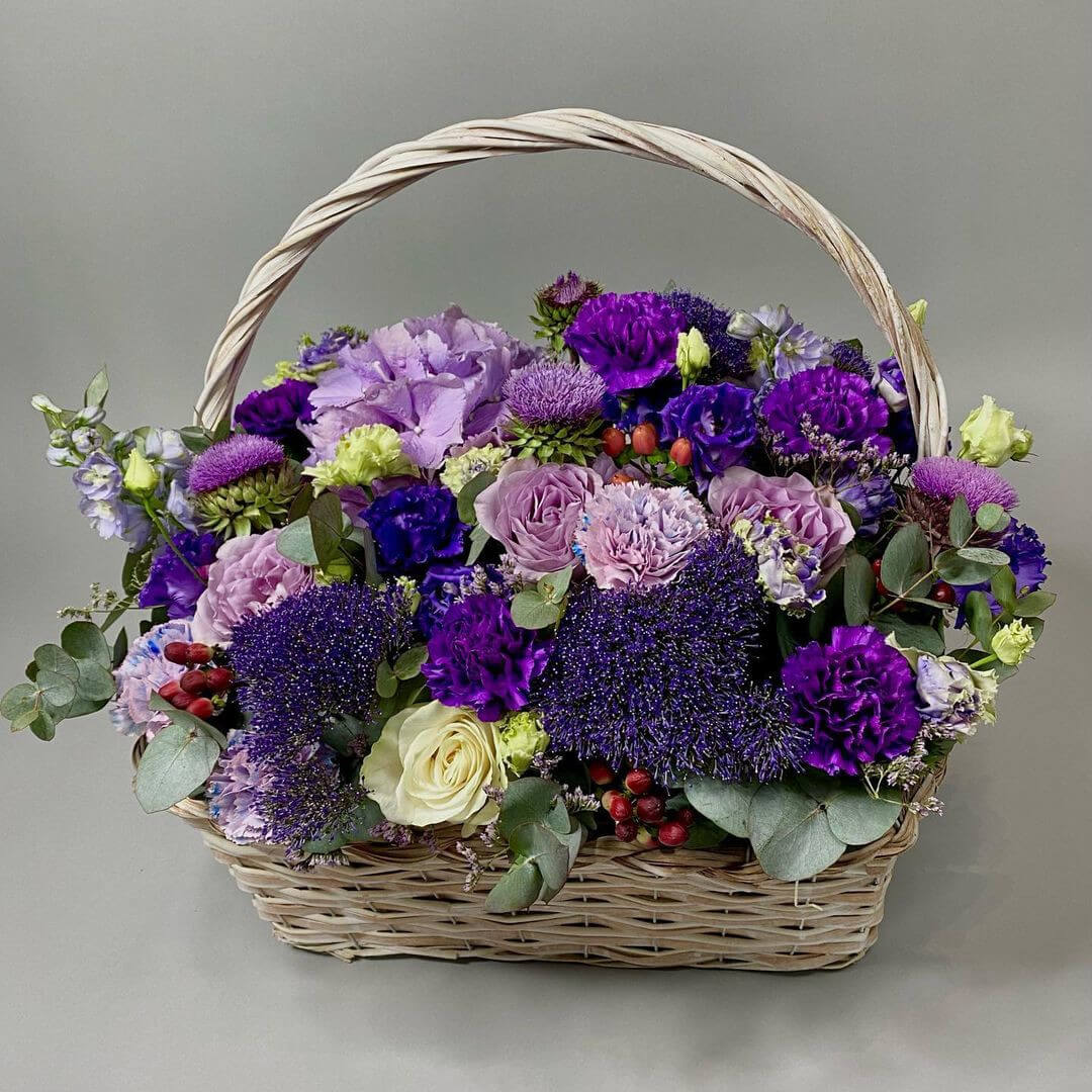 • 10 трахелиума, 10 роз, 20 гвоздик, 1 гортензия, 10 гиперикум, эвкалипт