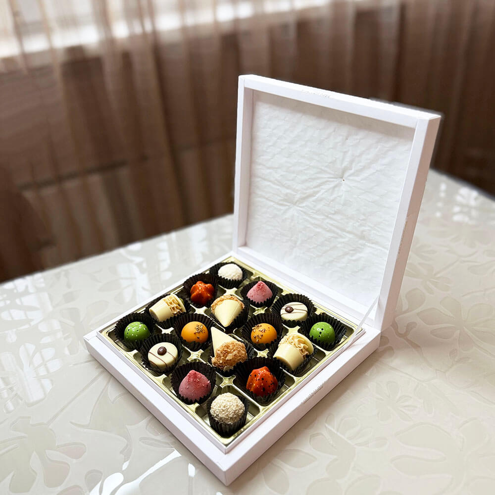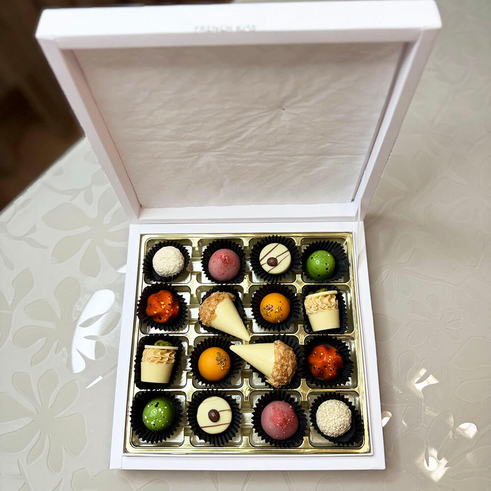 • молочный шоколад (сахар-песок, какао-масло, цельное сухое молоко), горький шоколад 70%, шоколад белый.