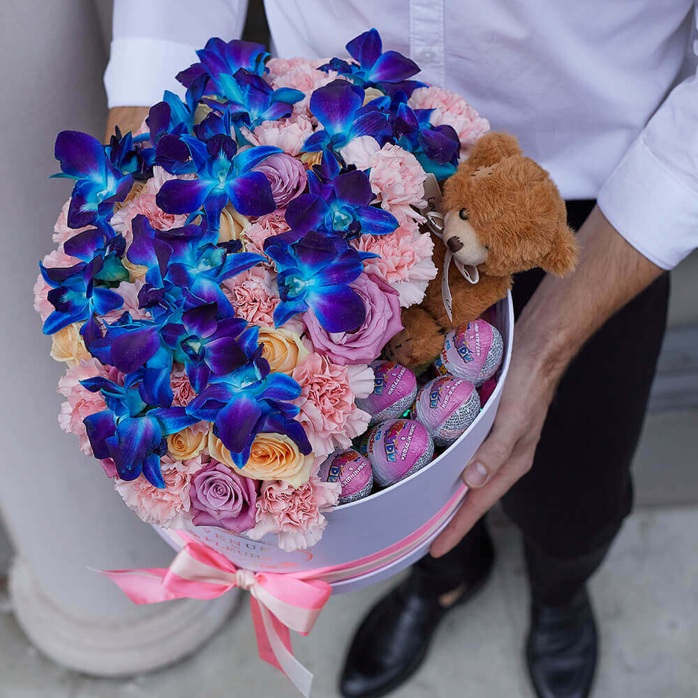• 20 гвоздик, 11 роз, 15 орхидей дендробиум, 5 киндеров, мишка