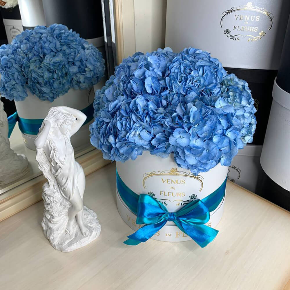 Предлагаем купить изысканные гортензии в шляпной коробке составом от 3 до 51 цветов.