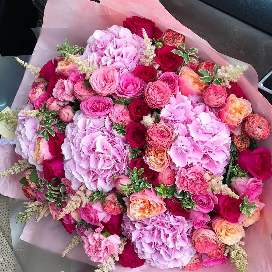 • 10 кустовых пионовидных роз, 10 пионовидных роз, 5 гортензий, 20 роз, зелень