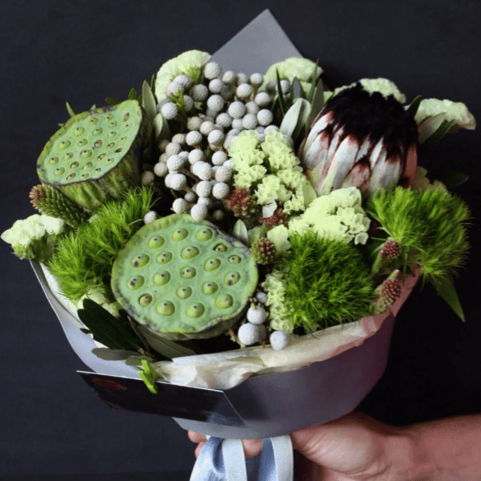 Форма может быть необычной, например, хорошо смотрятся вертикально ориентированные и каскадные цветы. Классические круглые композиции чаще дарят женщинам. Флористы делают монобукеты для мужчин или сборные с 2–3 разными растениями в составе. Сочная зелень создает необходимый контраст.