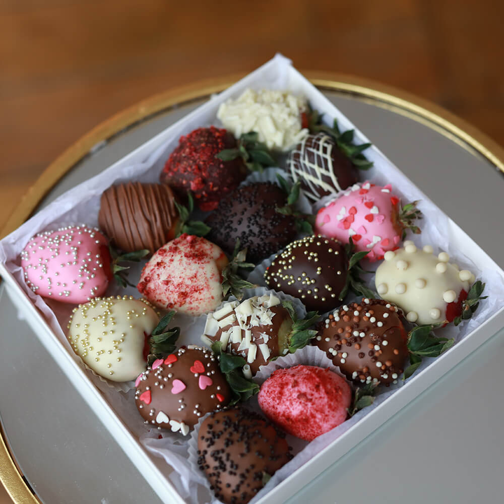 • Молочный шоколад, горький шоколад, белый шоколад, шоколадная стружка, сахарные посыпки (шарики, сердечки), рисовые шарики, сублимированная малина. Количество зависит от сезона поставки и меняется в диапазоне 16-20 шт.
