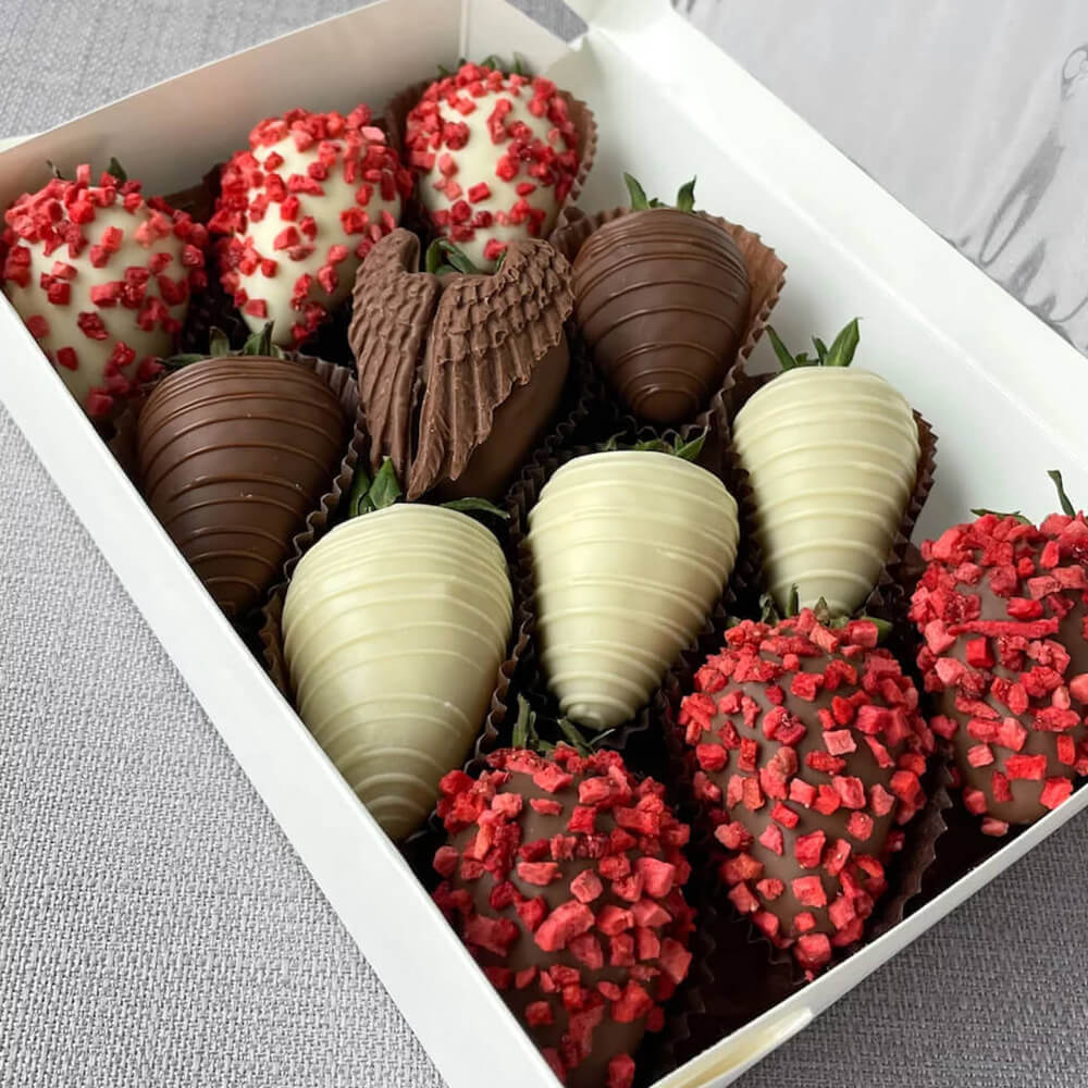 • Набор клубники в белом шоколаде, украшенной кокосовой стружкой, кондитерской посыпкой и кандурином,