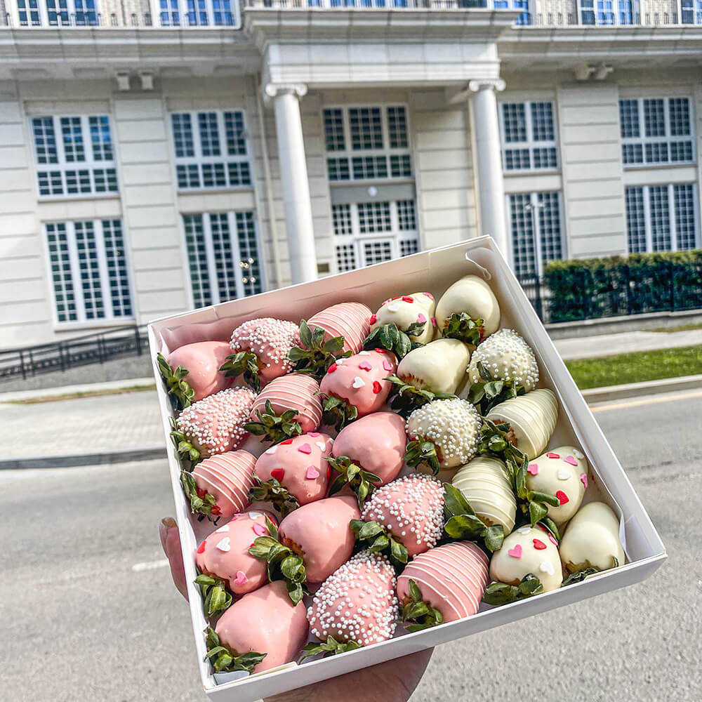 • Розовый шоколад, белый шоколад, сахарные посыпки (шарики, сердечки). Количество зависит от сезона поставки и меняется в диапазоне 16-20 шт.