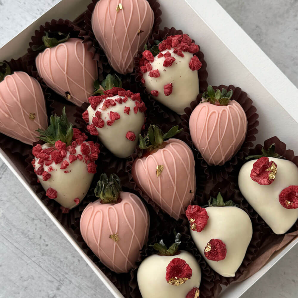 • Набор клубники в белом шоколаде, украшенной кокосовой стружкой и кондитерскими посыпками.