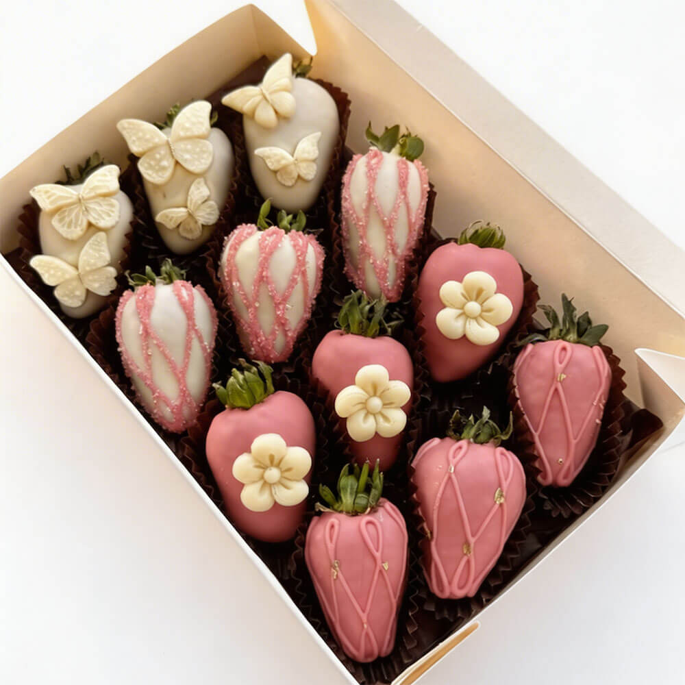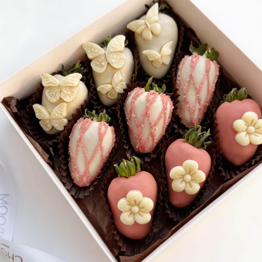 • Набор клубники в белом и молочном шоколаде, украшенной кокосовой стружкой, золотым сахаром и кондитерской посыпкой.