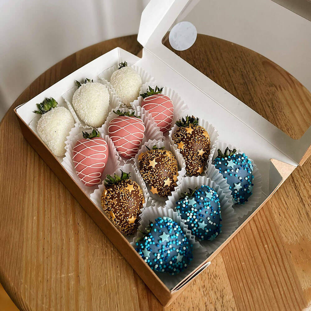 • Набор клубники в белом и молочном шоколаде, украшенной кокосовой стружкой, золотым сахаром и кондитерской посыпкой.