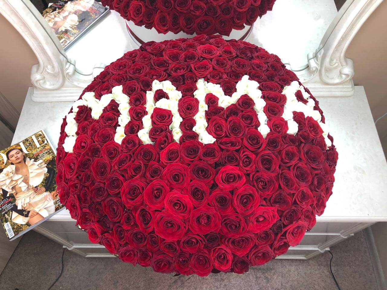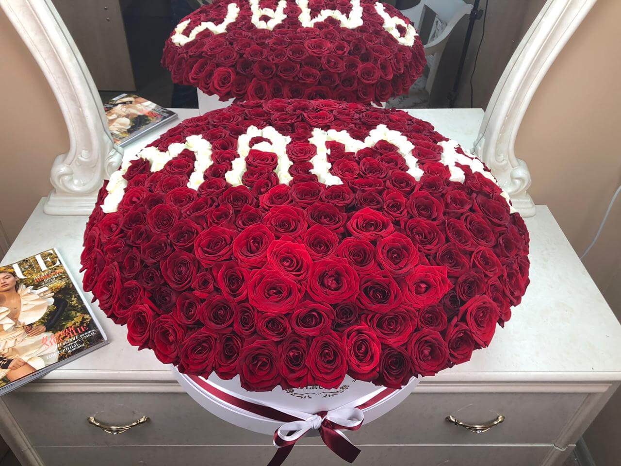 • белая коробка ручной работы, атласные ленты, флористическая губка