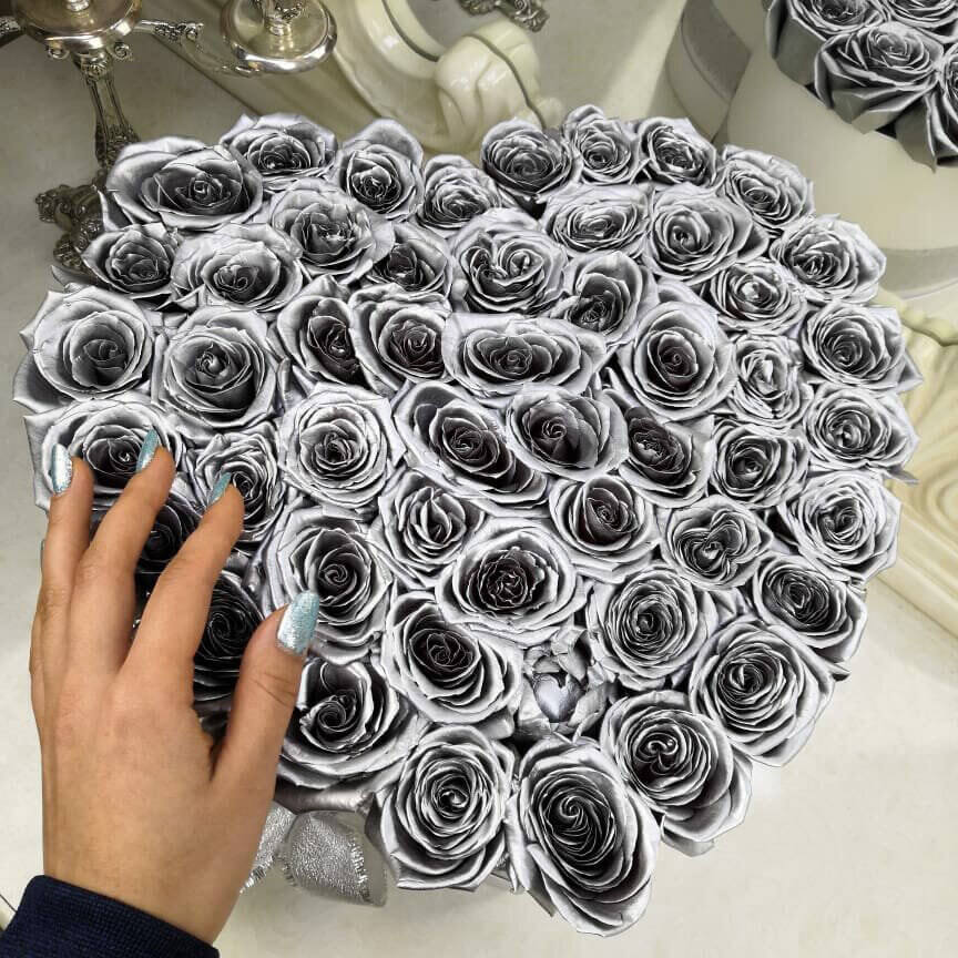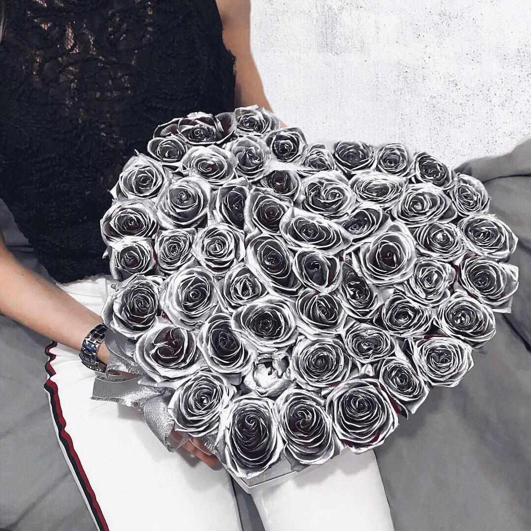 Эта невероятная композиция поможет Вам выразить самые искренние чувства. Подходит людям, которые любят серебряный цвет. Такой букет будет отличным дополнением к подарку, например, на серебряную свадьбу.