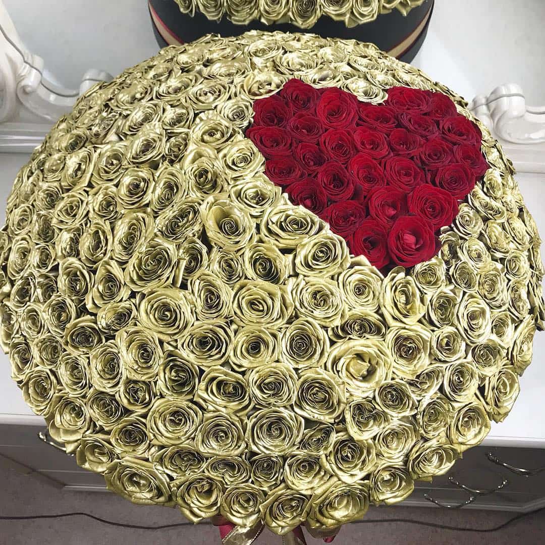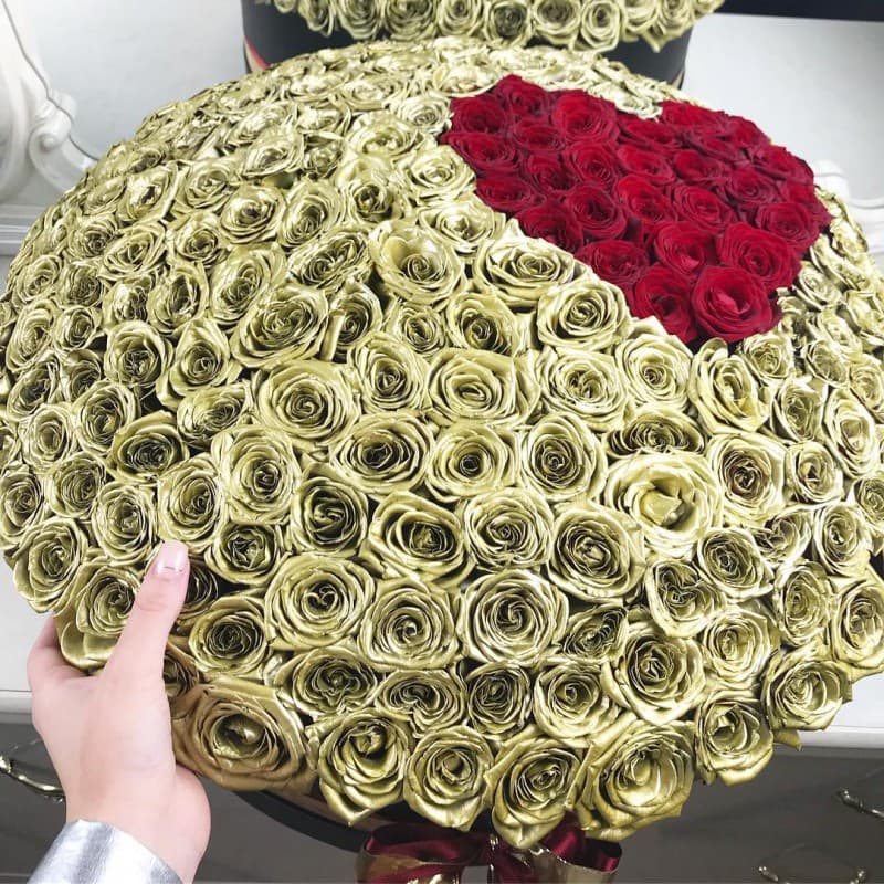 Сочетание золотого и красного - это царское сочетание цветов. Такой букет шикарен и стилен. Красное сердце на фоне золотых роз расскажет о самых искренних чувствах. Он точно произведет впечатление даже на самых избирательных особ.
