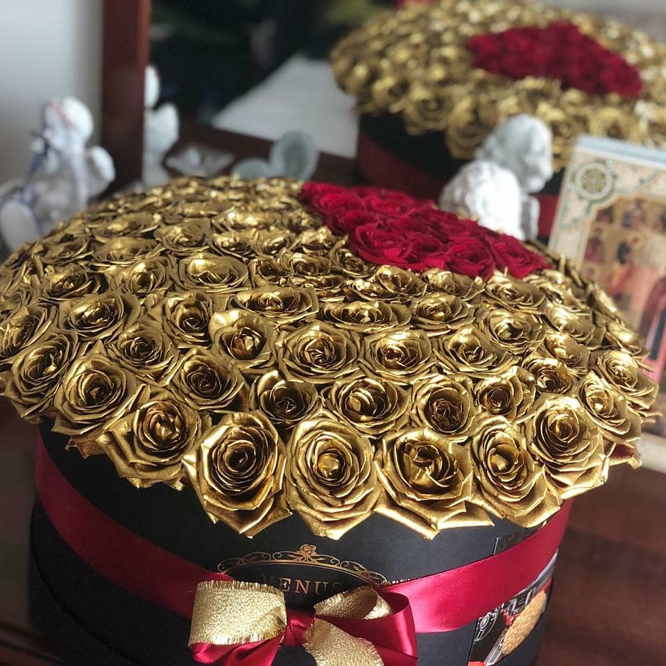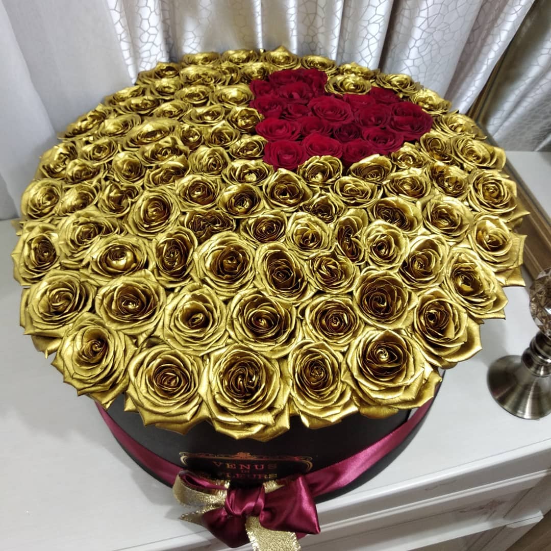 Роз золотого цвета в природе не существует. Для их производства мы используем живые цветы и только высококачественную флористическую краску без запаха из Германии. Она гипоаллергенна, не пачкается и не осыпается. Ароматизируем розы легким цветочным парфюмом.