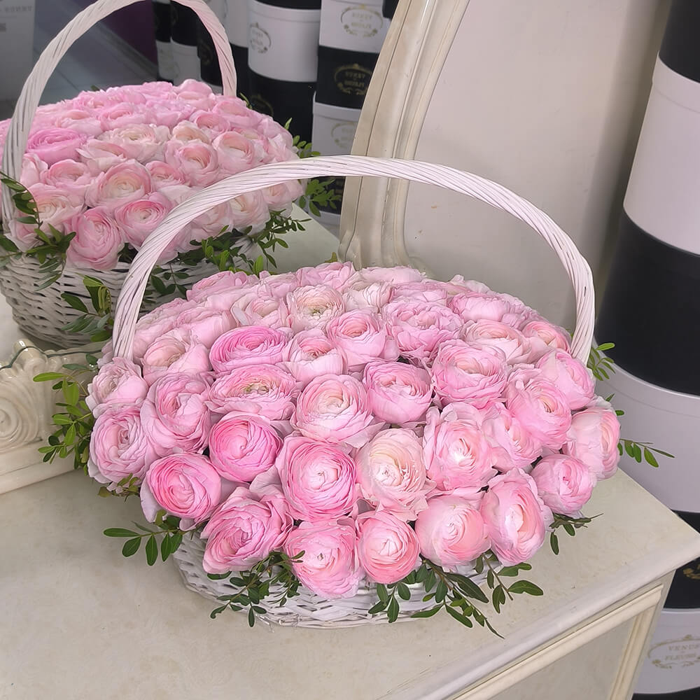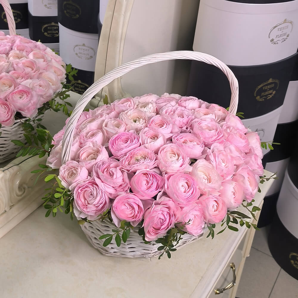 Это очень нежная и душевная композиция - цветы в корзине. Такой подарок точно станет центром внимания на любом торжестве.