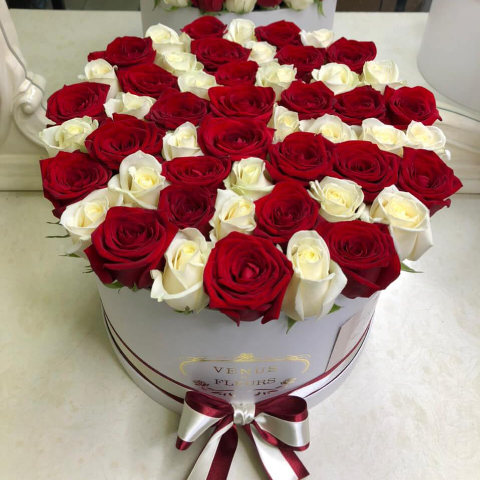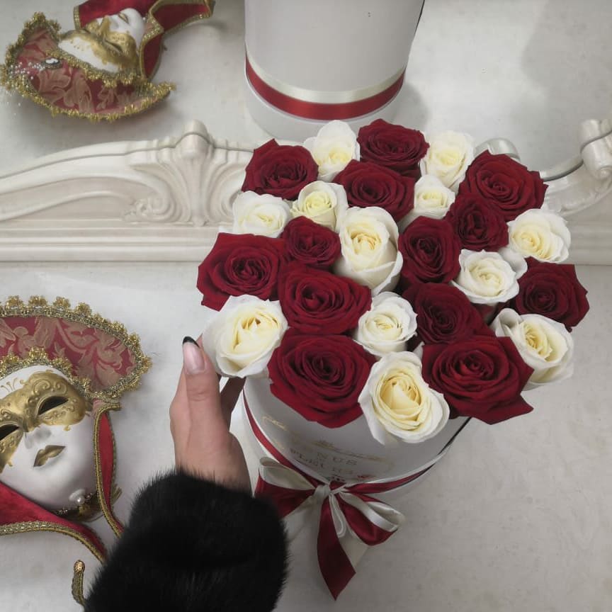 Стильная и элегантная композиция из красных и белых роз станет отличным подарком на любое торжество для самых любимых и близких.