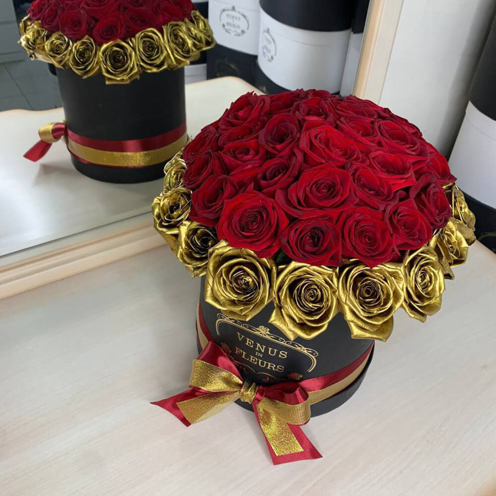 Стильная и элегантная композиция из красных и золотых роз станет отличным подарком на любое торжество для самых любимых и близких.