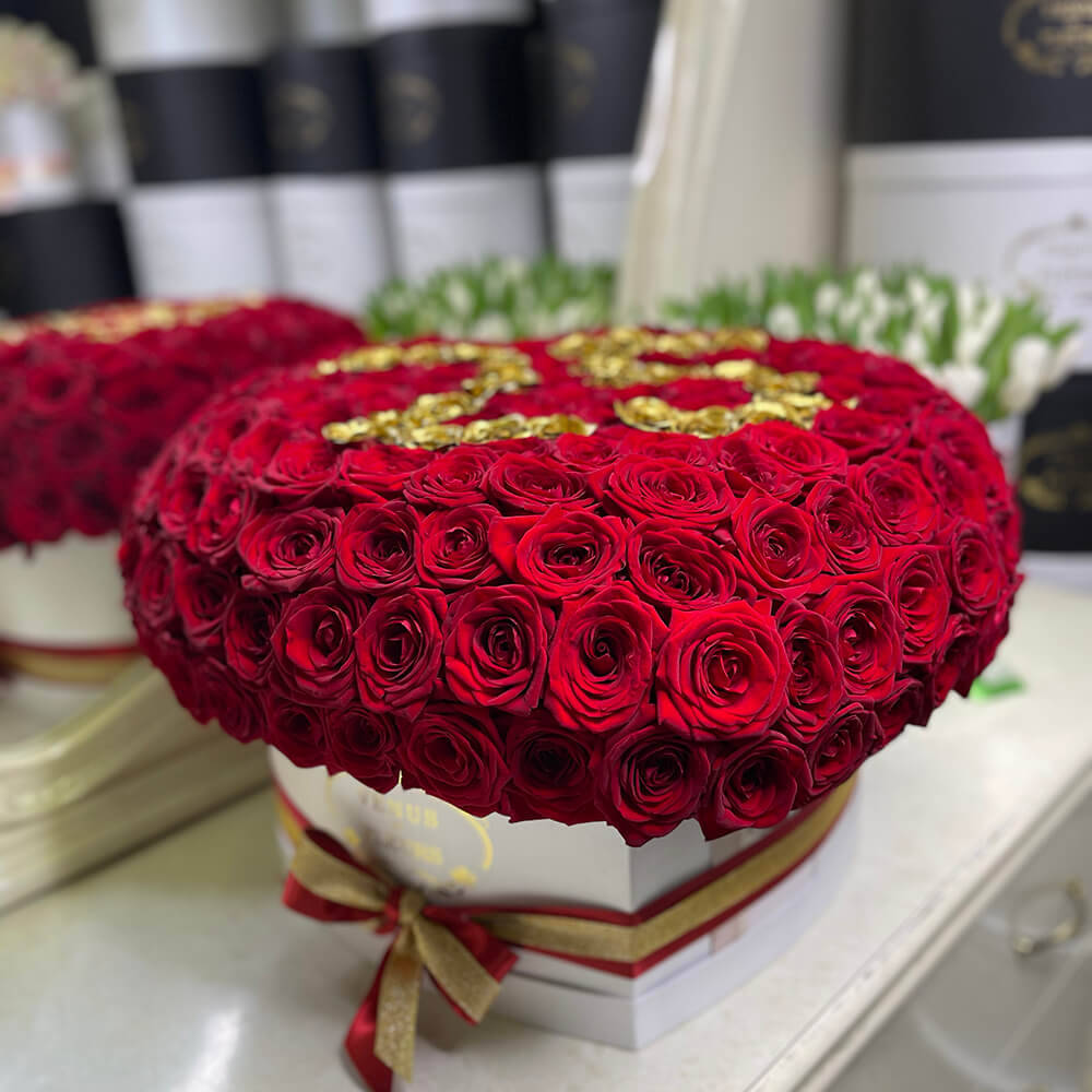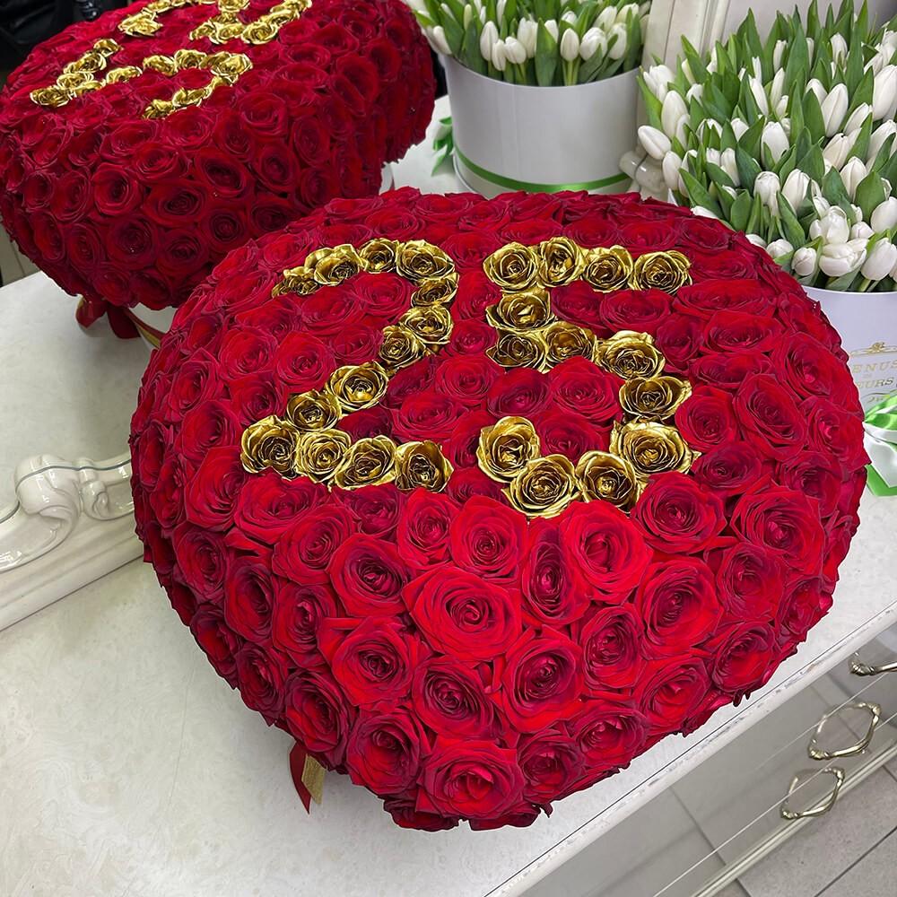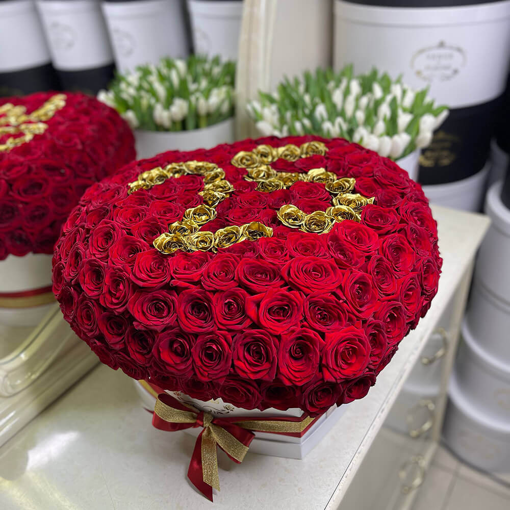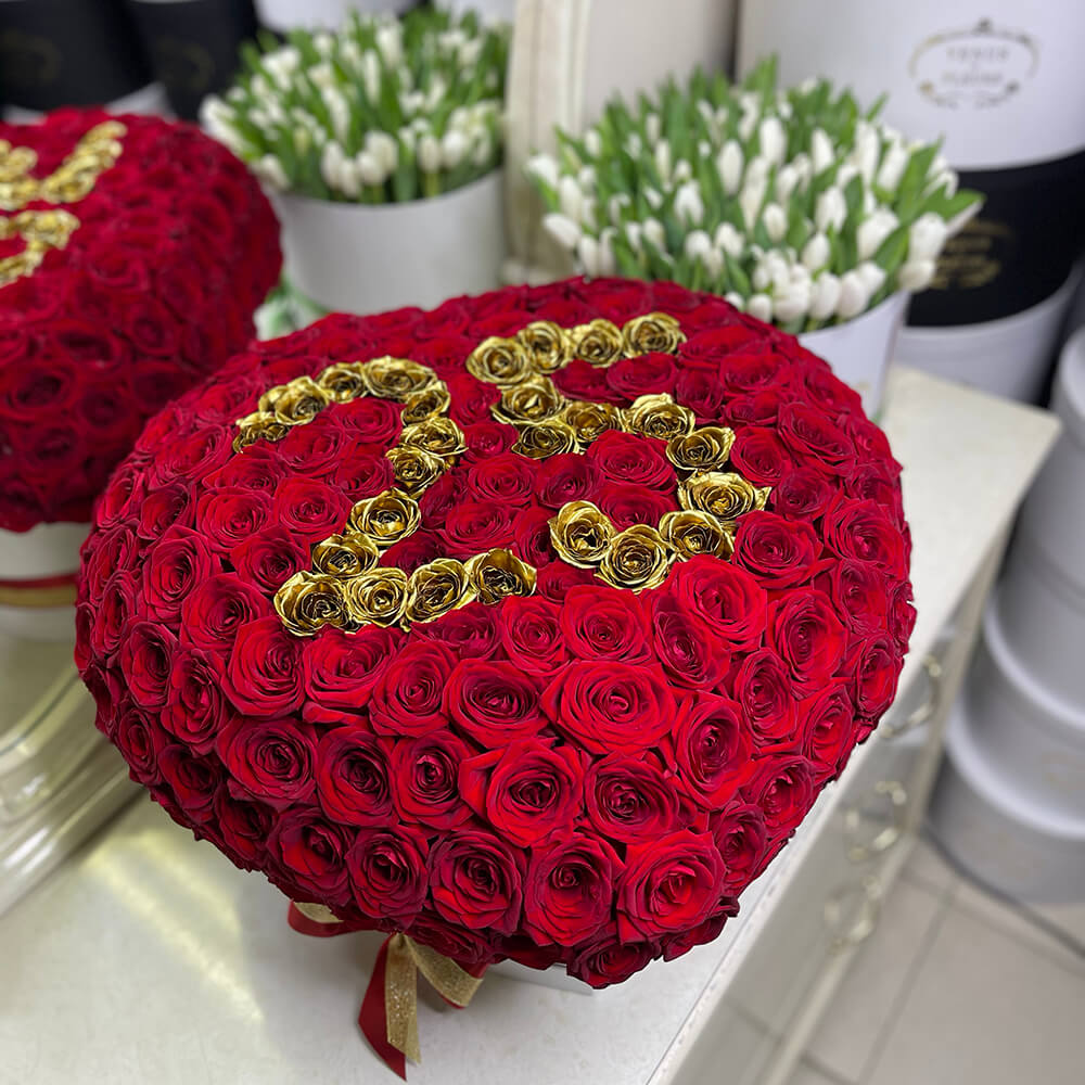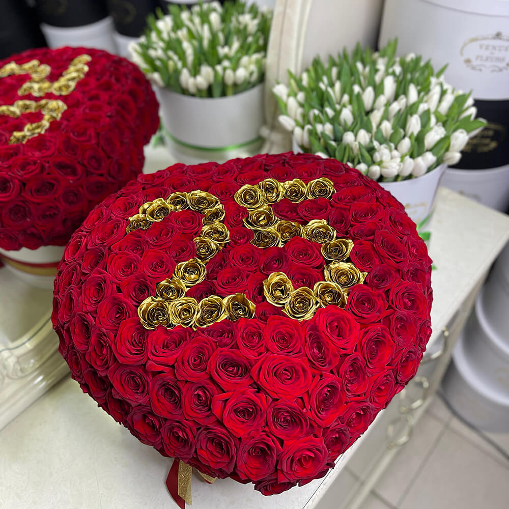 Это необычное сочетание красных роз с золотыми является эксклюзивным в истории флористики. Невероятные расцветки, которых она ещё никогда не видела, абсолютно точно произведут впечатление. Ваша вторая половинка будет в восторге, увидев такое чудо в живую. Цветы мы закупаем каждое утро, чтобы они оставались максимально свежими; именно поэтому они Вас будут радовать от 7 до 14 дней.