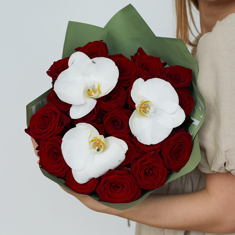 • 21 роза, орхидеи