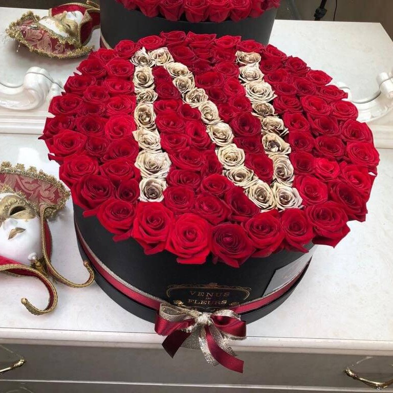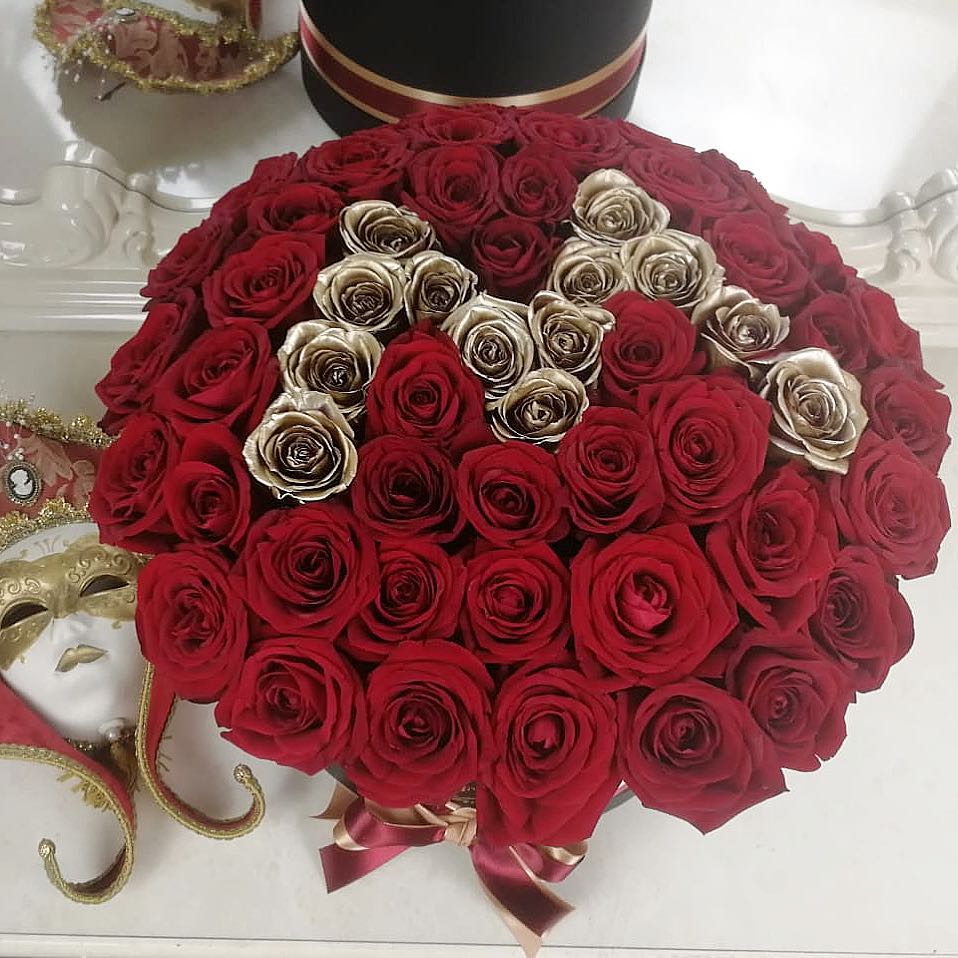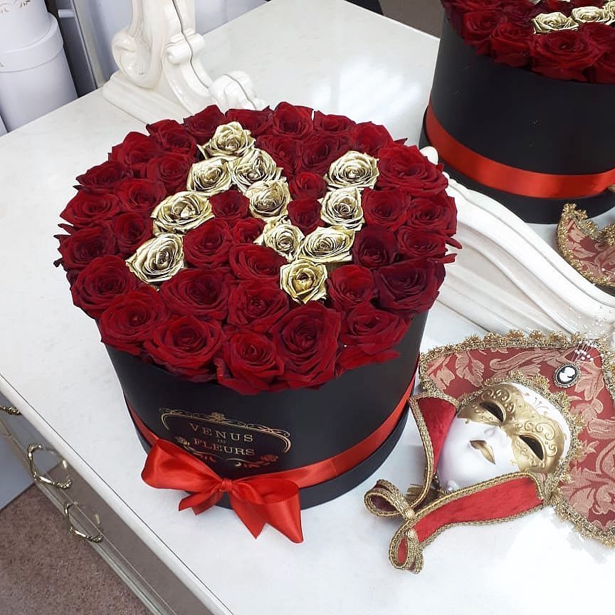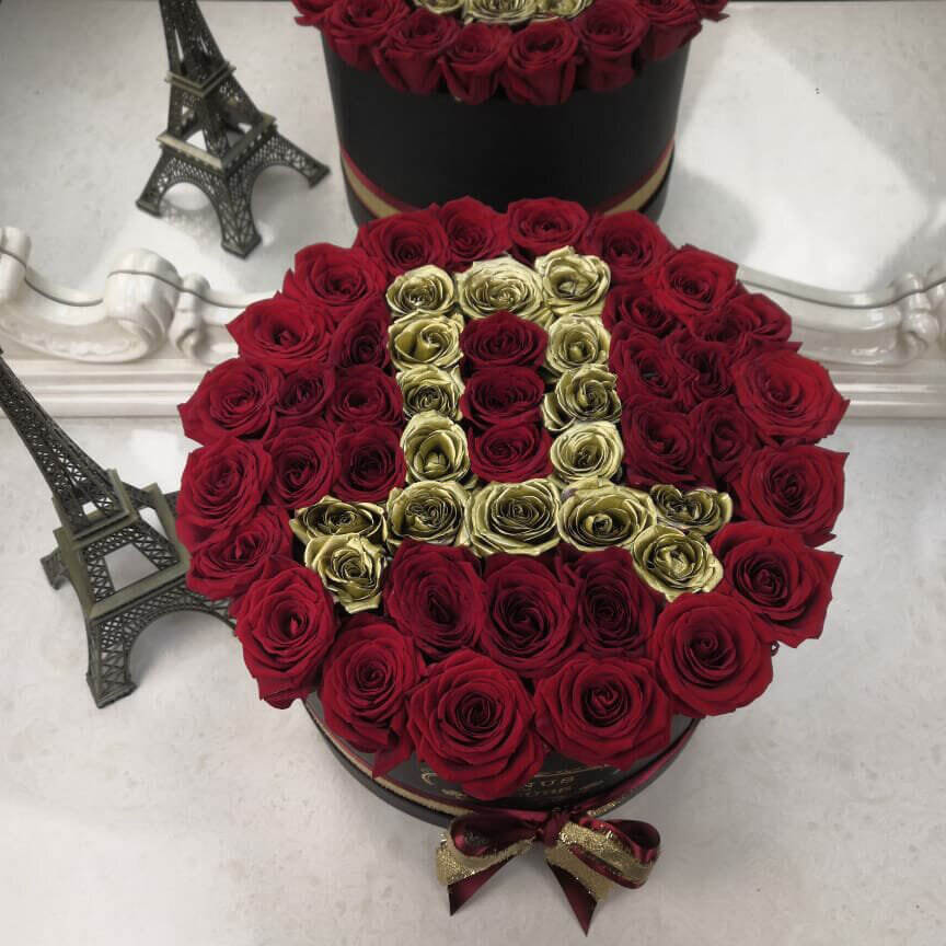 Стильная и элегантная композиция из красных роз с золотой буквой станет отличным подарком на любое торжество для самых любимых и близких.