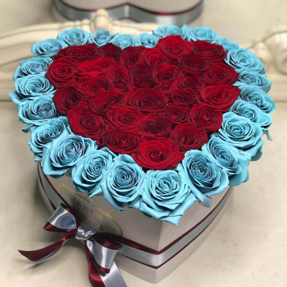 Роз голубого цвета в природе не существует. Для их производства мы используем живые цветы и только высококачественную флористическую краску без запаха из Германии. Она гипоаллергенна, не пачкается и не осыпается. Ароматизируем розы легким цветочным парфюмом.