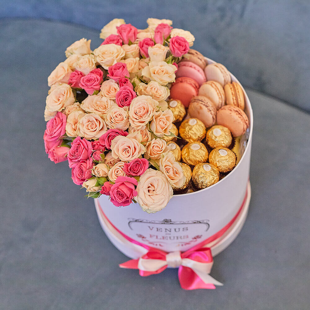 • 25 кустовых роз, 7 шт. макаронс, 9 шт. Ferrero