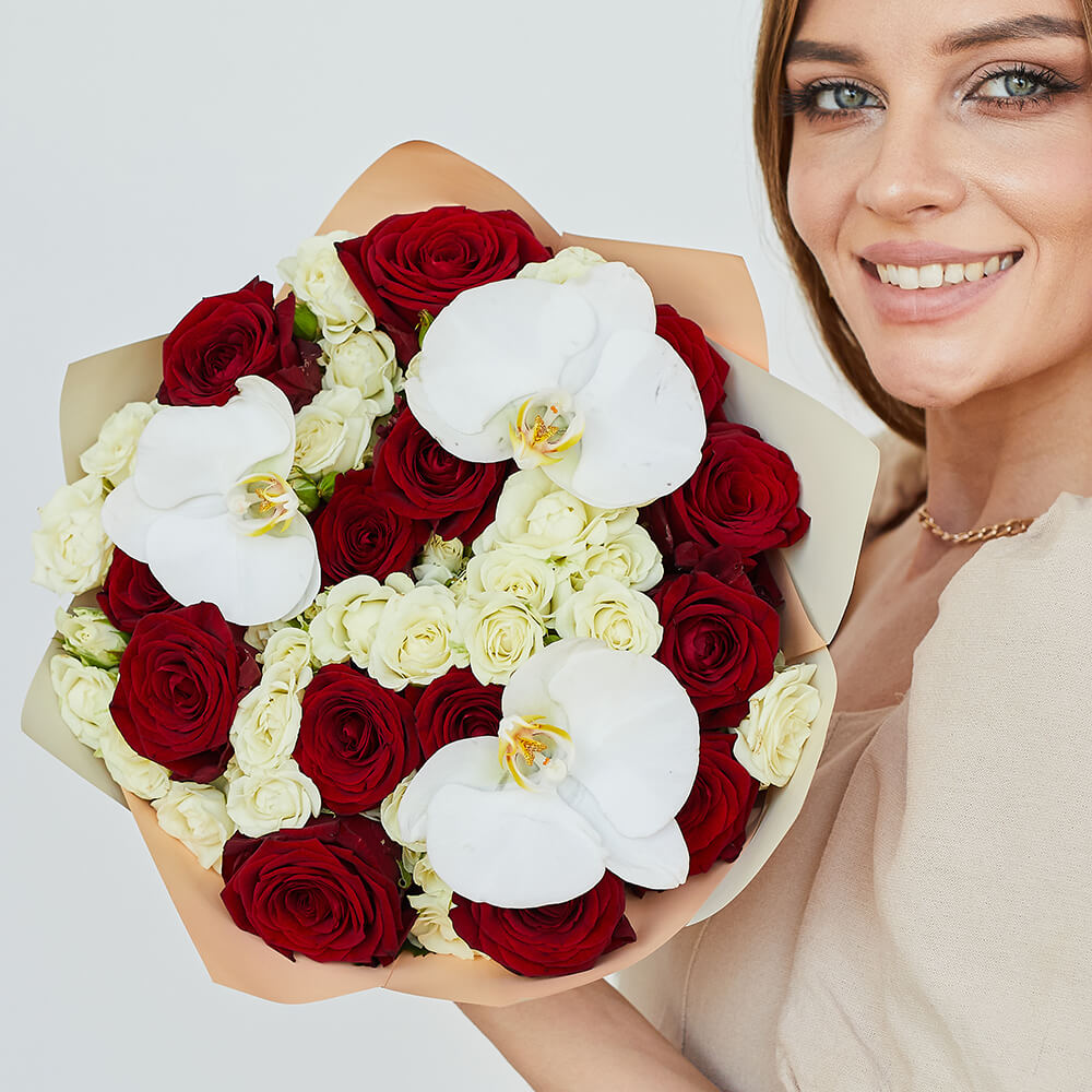 • 16 кустовых роз, 17 роз, орхидеи