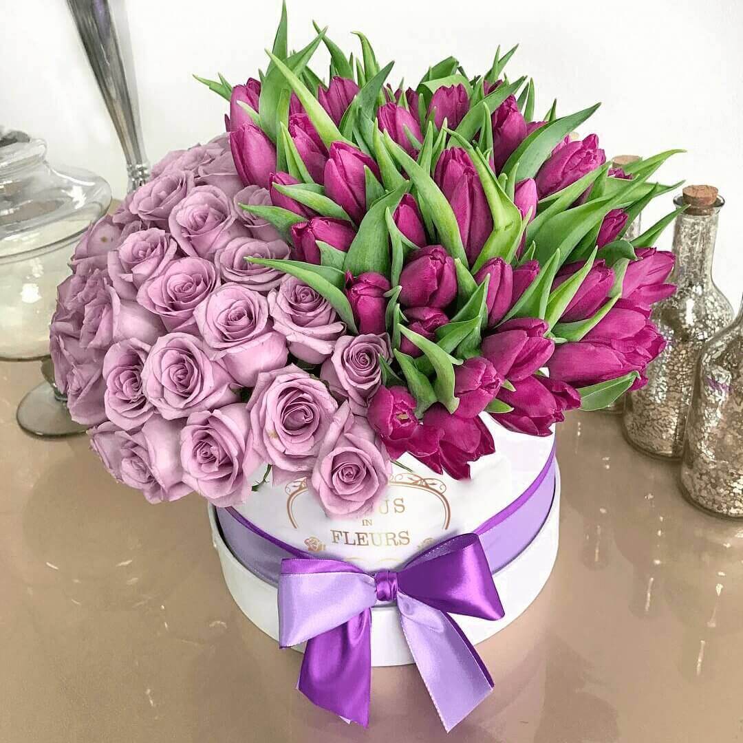 Яркие малиновые тюльпаны и лиловые розы создают невероятную композицию, способную покорить любое сердце