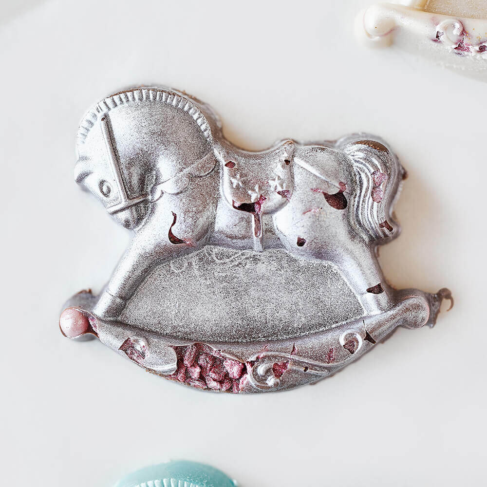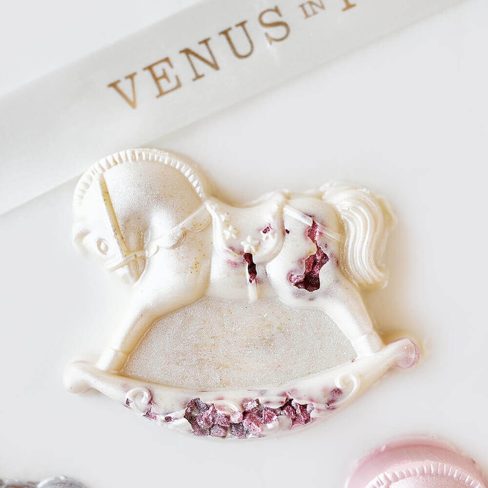 • сахар; масло какао; сухое цельное молоко; эмульгатор: соевый лецитин; натуральный ароматизатор: ваниль, краситель натуральный малина - порошок, краситель натуральный чай матча голубой, кандурин серебро. Вес 70-75 гр