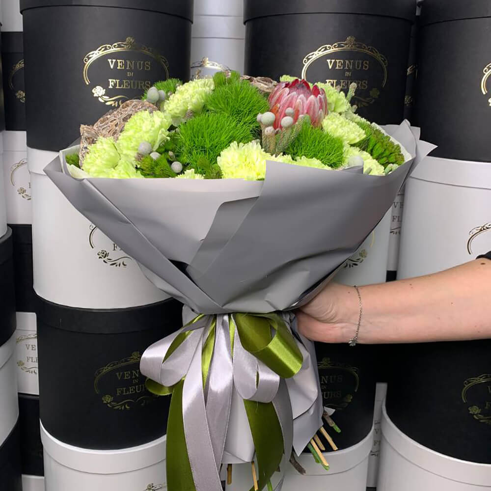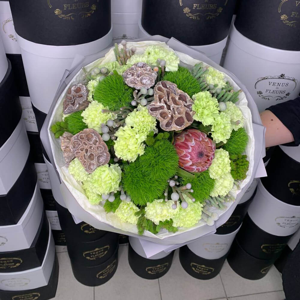 • 2 лотоса, 1 протея, 5 брунии, 8 гвоздик, 3 диантуса, зелень