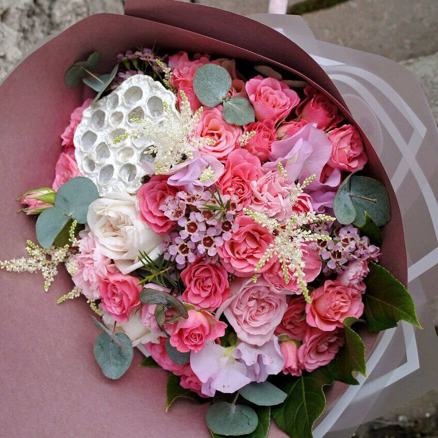 • 1 лотос, 11 кустовых роз, 5 пионовидных роз, эвкалипт, оксипелатум, салал