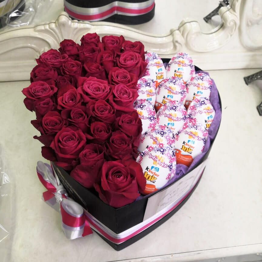 Подсластите жизнь своим любимым и сделайте подарок из киндеров и нежных роз в коробке в форме сердца. Ваша любимая удивиться подаренному чуду, аналогов нет.