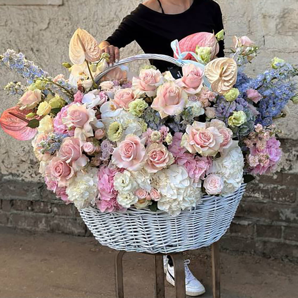 • 16 гортензий, 25 роз, 10 дельфиниумов, 10 эустом, 20 кустовых роз, 10 маттиол, 6 орхидей фаленопсис, 4 антириума