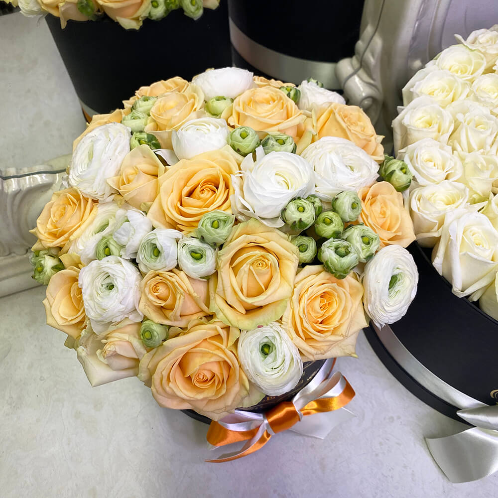 Мини-коллекция олицетворяет самые нежные и искренние чувства к Вашей второй половинке. Букет из классических роз и ранкнкулюсов в шляпной коробке удивит вашу любимую своей безупречностью и соблазнит своим ароматом.