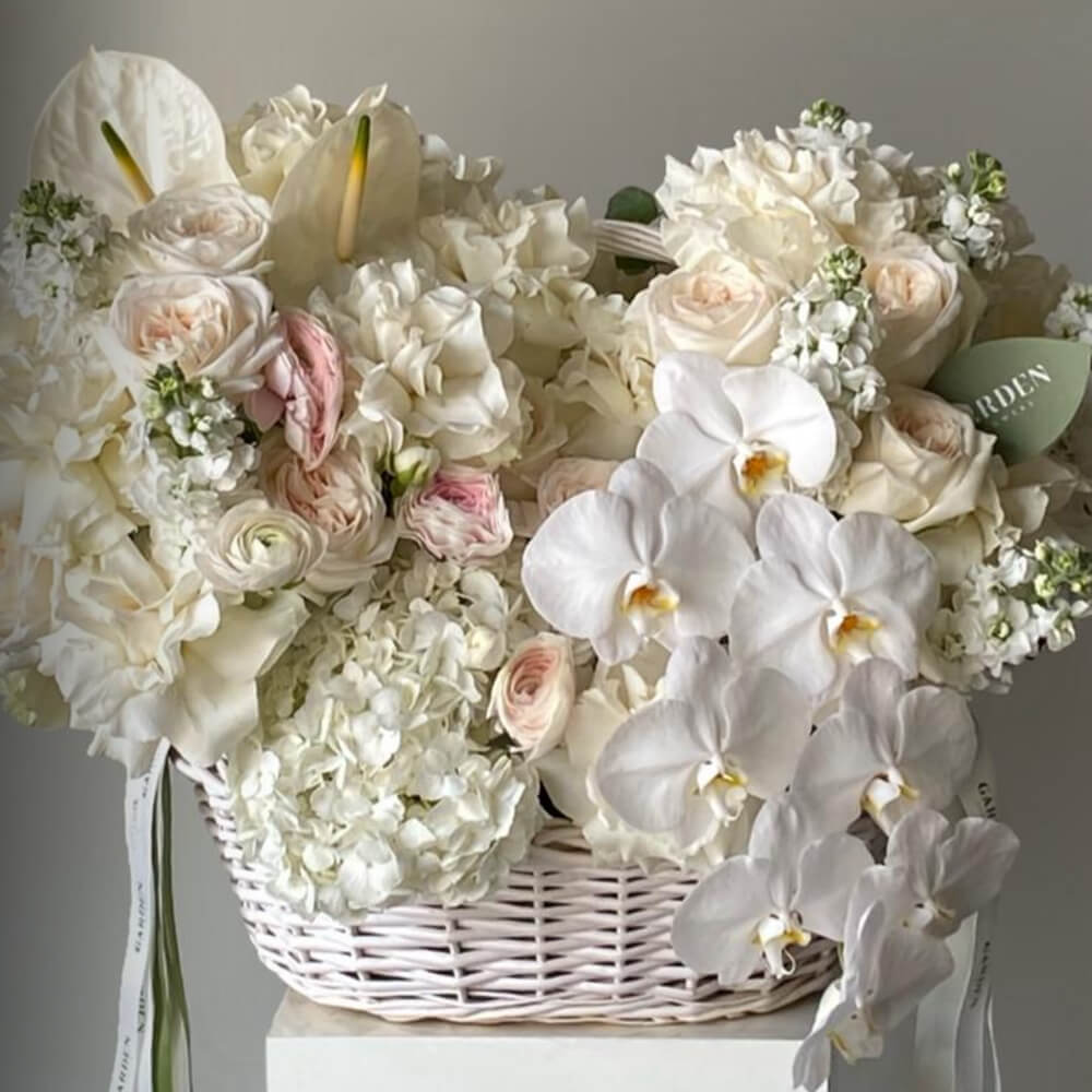 Это очень нежная и душевная композиция - цветы в корзине. Такой подарок точно станет центром внимания на любом торжестве.