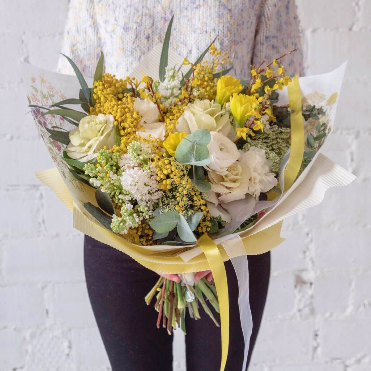 • 3 ранункулюса, 4 маттиолы, брассика, эвкалипт, 3 мимозы, 3 нарцисса