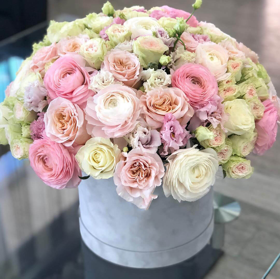 Цветочная композиция олицетворяет самые нежные и искренние чувства к Вашей второй половинке. Композиция из ранункулюсов в шляпной коробке удивит вашу любимую своей безупречностью и соблазнит своим ароматом.