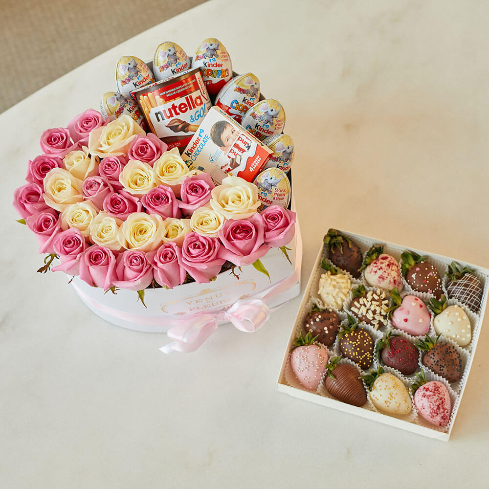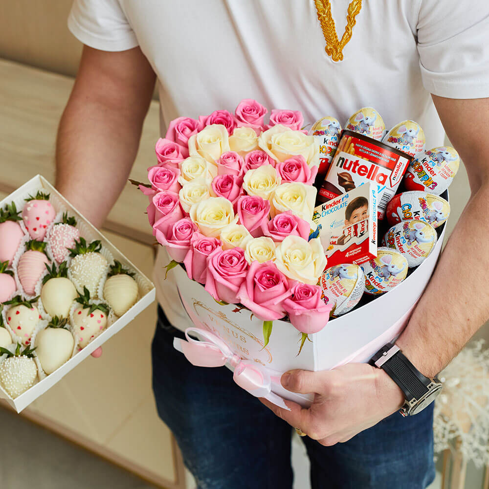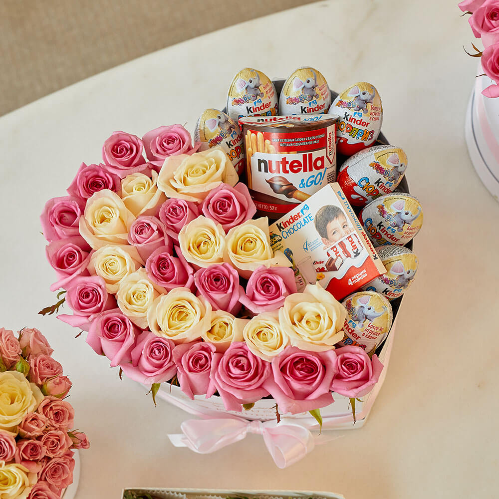 Подсластите жизнь своим любимым и сделайте подарок из киндеров и нежных роз в коробке в форме сердца. Ваша любимая удивиться подаренному чуду, с удовольствием полакомится вкусным шоколадом. Аналогов такого букета нет.