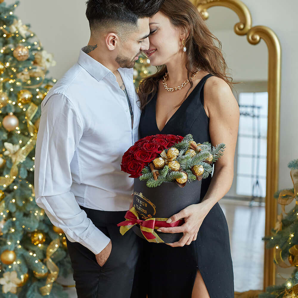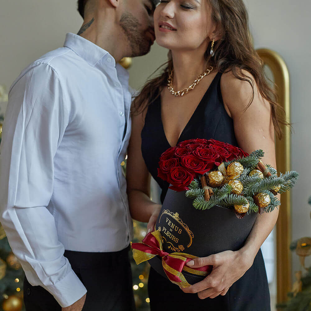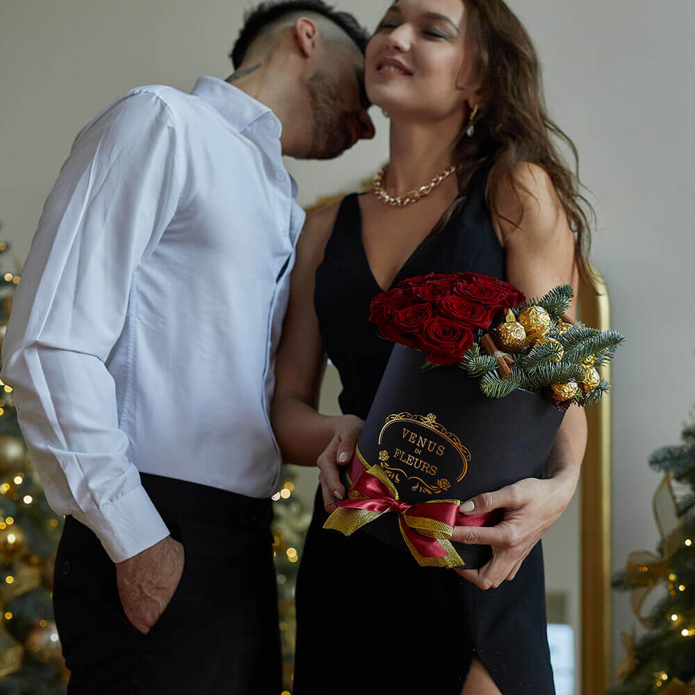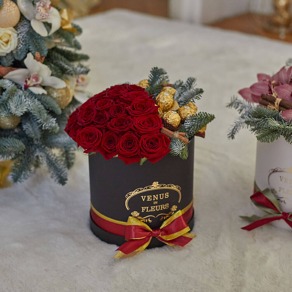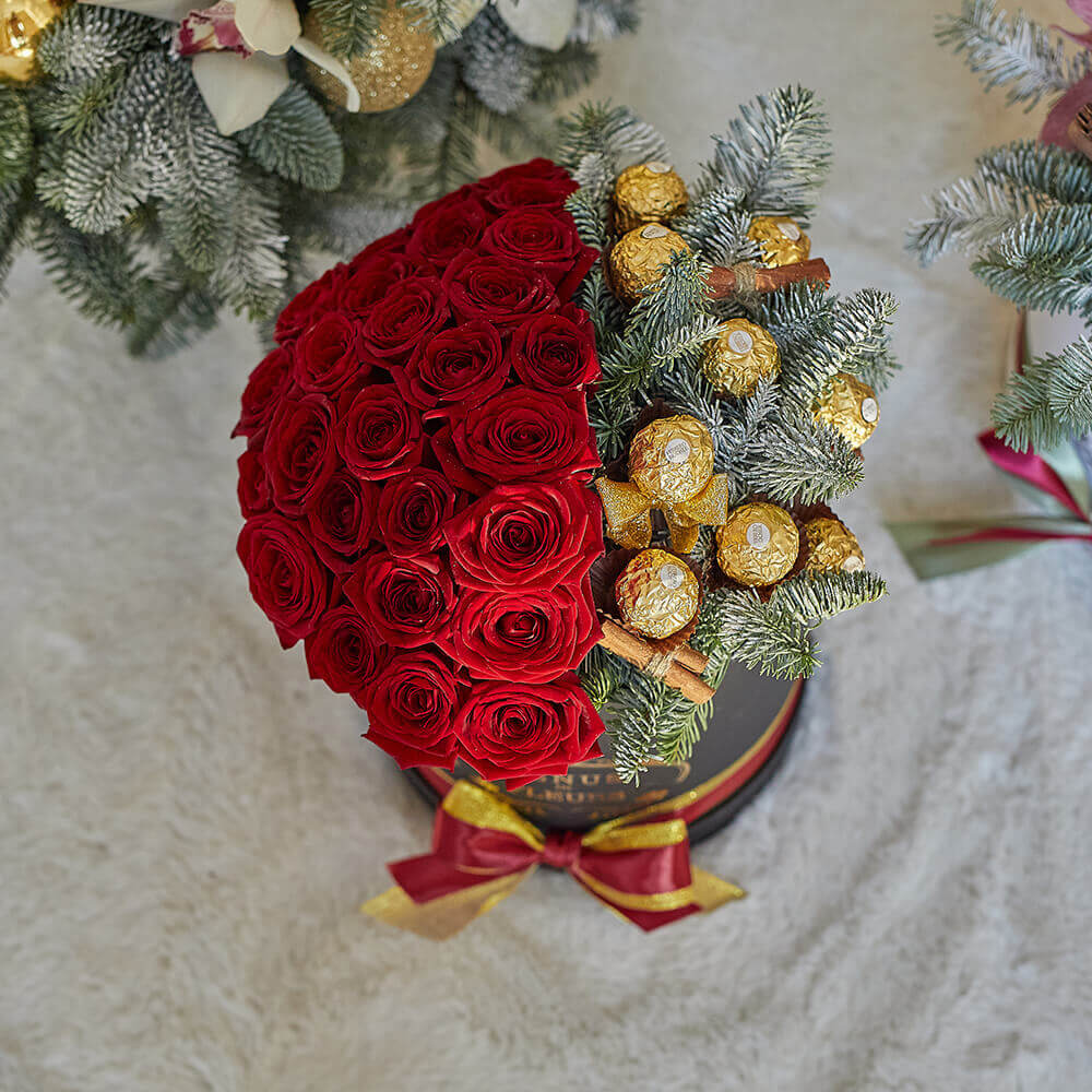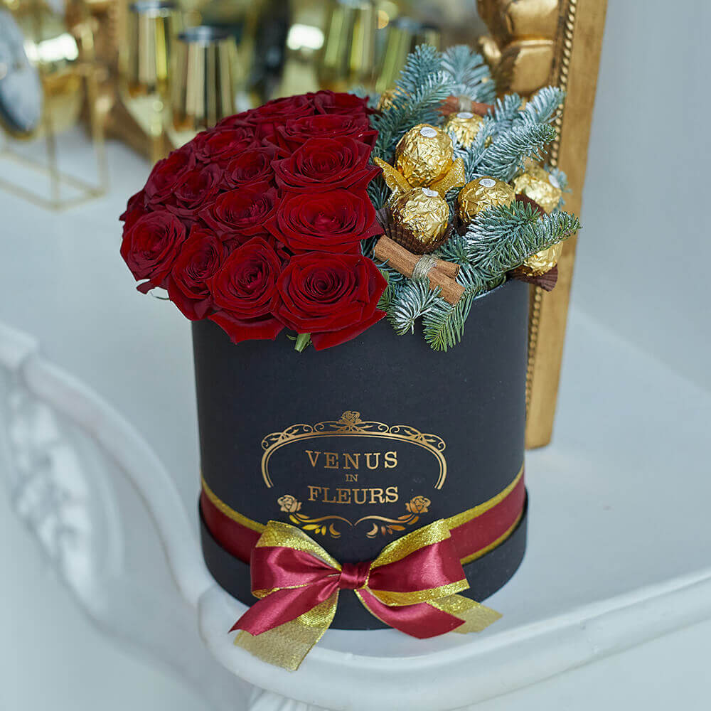 Букет на новый год в коробке - это отличный подарок, который восхитит своей красотой, необычностью и элегантностью.