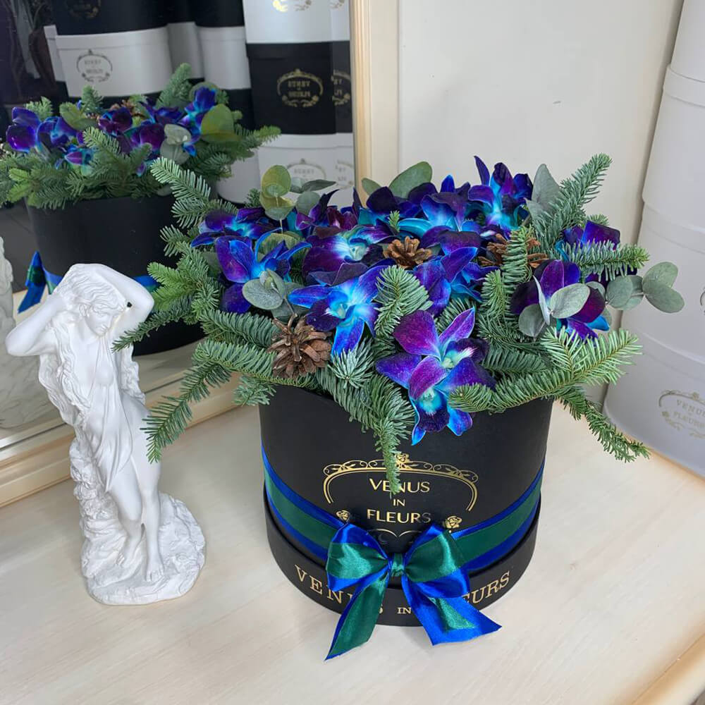 Букет на новый год в коробке - это отличный подарок, который восхитит своей красотой, необычностью и элегантностью.