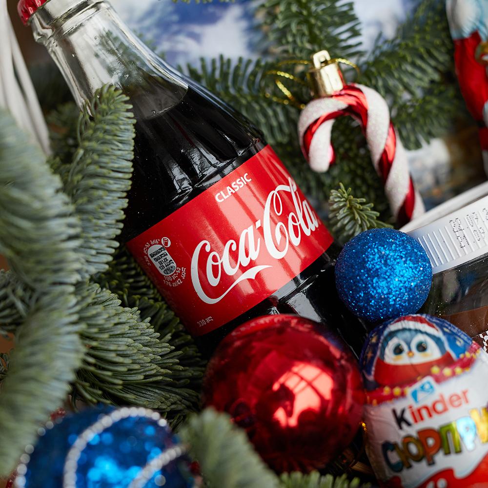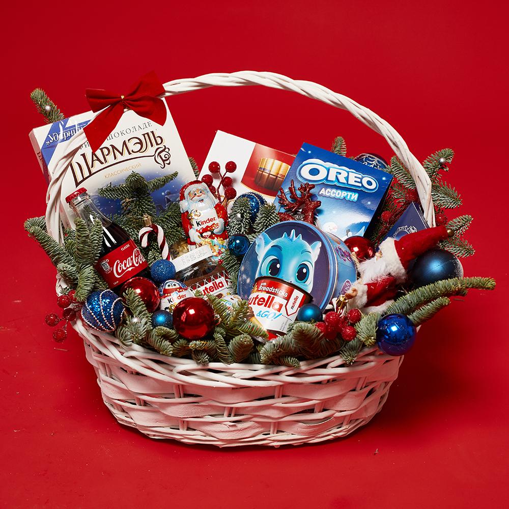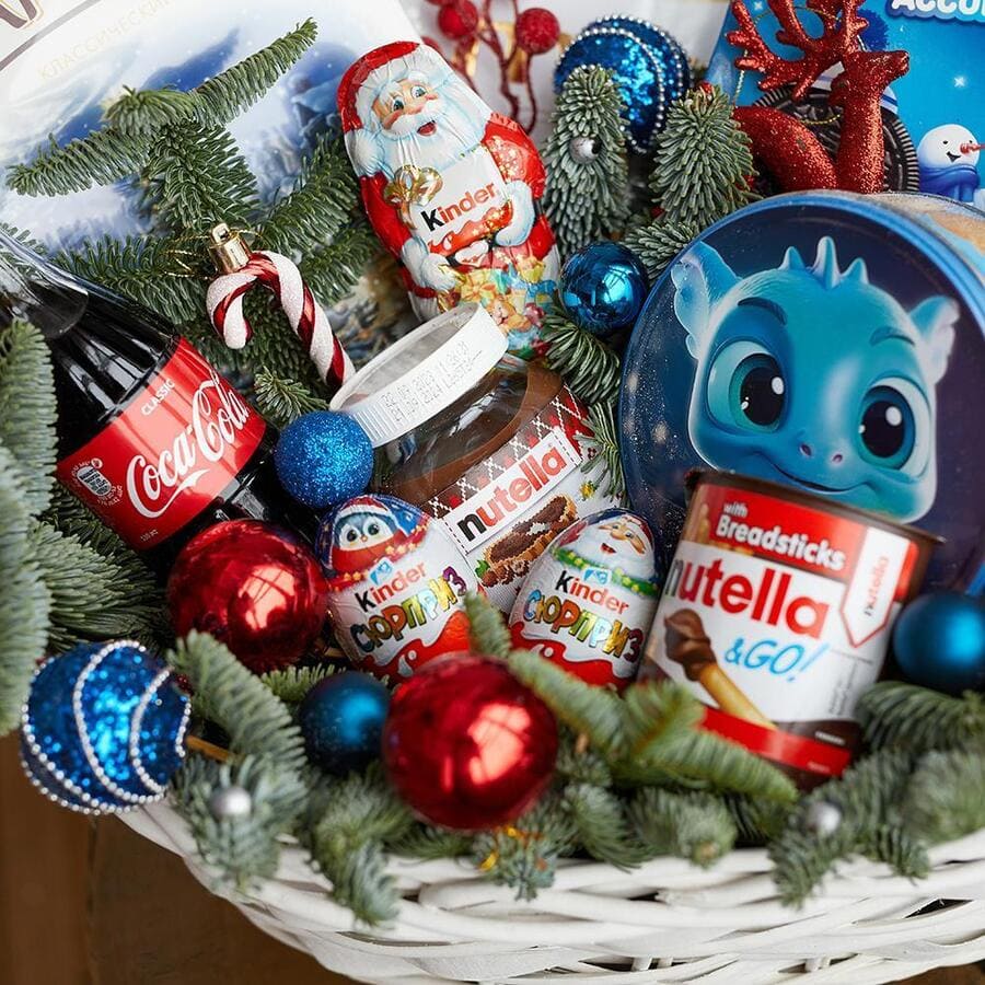 - нуттела с палочками- 1 шт., новогодние игрушки - 7 шт., киндер сюрприз - 2 шт., нобилис - 3 шт., киндер дед мороз - 1 шт., печенье орео - 1 шт., дед мороз - 1 шт., нуттела 180 гр - 1 шт., зефир шармель 150 гр. - 1 шт., вдохновение 100 гр. - 1 шт., набор Мерси - 1 шт., печенье с драконом - 1 шт., Coca-Cola 0,33 - 1 шт. (возможна замена)