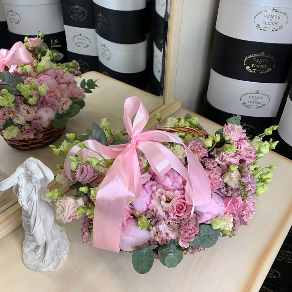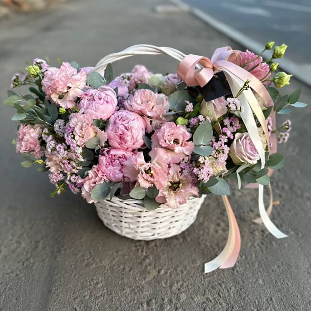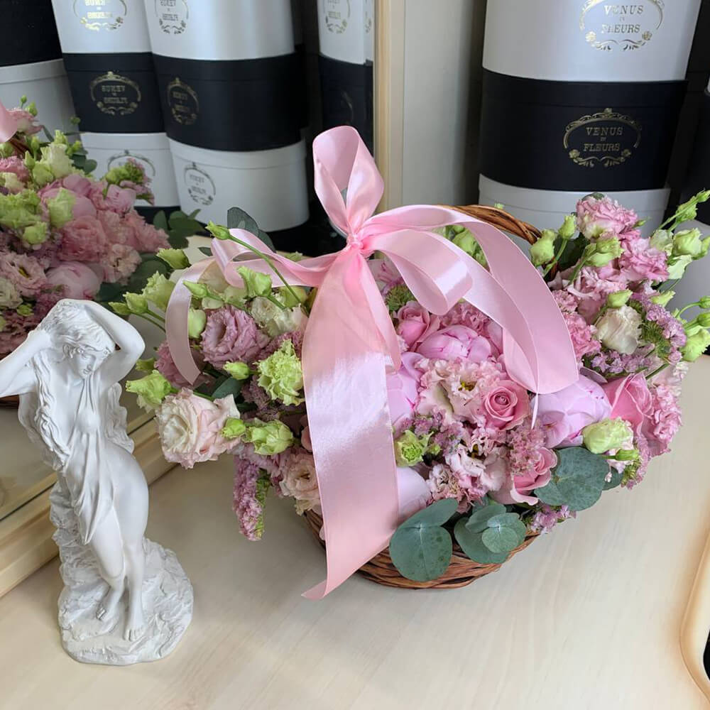 Это очень нежная и душевная композиция - цветы в корзине. Такой подарок точно станет центром внимания на любом торжестве.